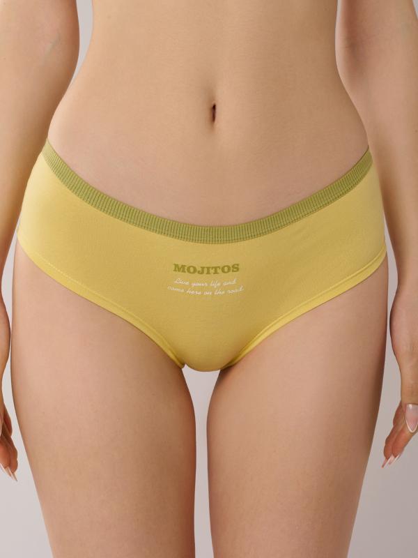 На трусы нанесён принт с надписью «MINT», «Lazy afternoon» и «JULEP» в оранжево-бежевых тонах.
