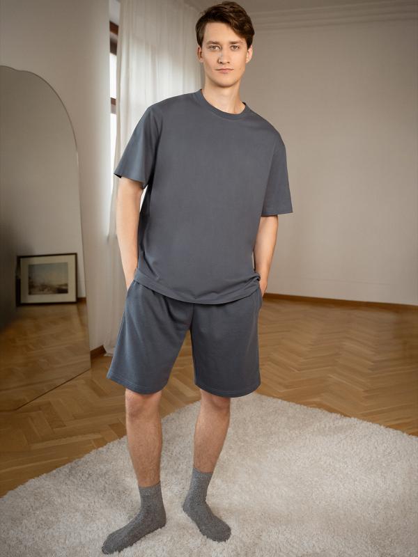Цвет : Серый Состав : 60% Хлопок 40% Полиэстер/ 100% Хлопок Мужская пижама Indefini выполнена в универсальном тёмно-сером цвете. Комплект состоит из классической футболки с коротким рукавом и круглым вырезом, а также свободных шорт на мягкой эластичной резинке с регулируемым шнурком и боковыми карманами.