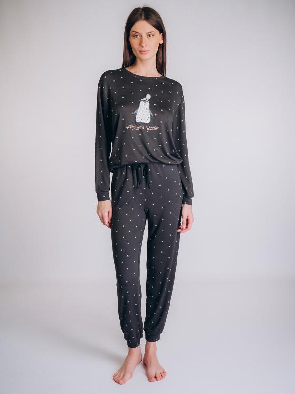 Цвет : Серый Состав : 95% Полиэстер 5% Эластан Женская пижама от бренда Indefini — это сочетание уюта, мягкости и зимнего настроения. Комплект выполнен в тёмно-сером цвете с изысканным принтом из мелких белых звёзд и изображением пингвина в шапке с надписью «Penguin’s Winter», что придаёт образу нотку тепла и игривости.
