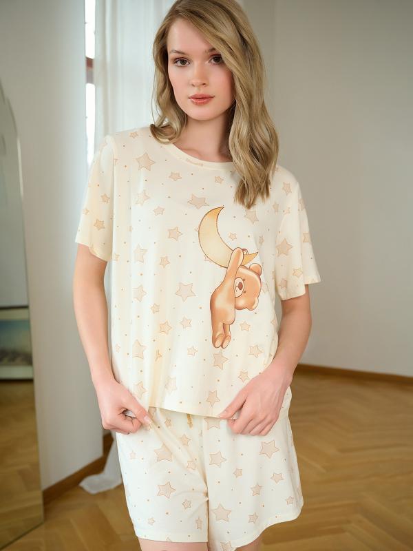 Футболка изготовлена из 100% хлопка, что обеспечивает отличную воздухопроницаемость и комфорт. Шорты выполнены из хлопка с добавлением полиэстера для большей износостойкости и мягкости. Лаконичный дизайн и прямой крой делают эту пижаму идеальным выбором для домашнего отдыха и сна.