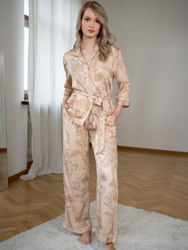 Цвет : Мультиколор Состав : 100% Вискоза Женская пижама Indefini выполнена в нежном розовом цвете с изысканным растительным принтом. Комплект состоит из рубашки на пуговицах с отложным воротником, рукавами и поясом на талии, а также прямых брюк на мягкой эластичной резинке.