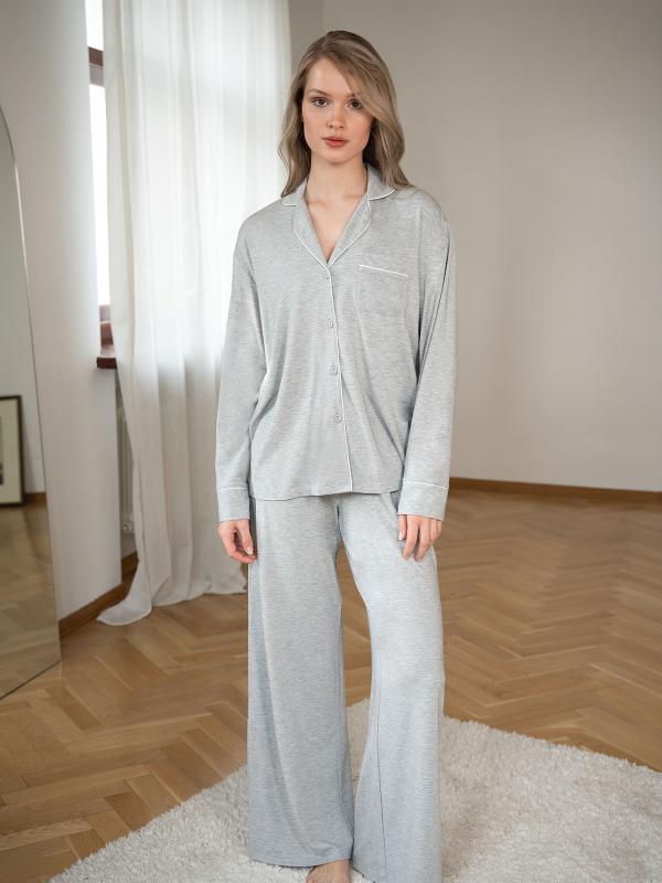 Женская пижама Indefini выполнена в светло-сером цвете из мягкой вискозной ткани с добавлением полиэстера и эластана. Комплект состоит из рубашки на пуговицах с длинными рукавами, отложным воротником и нагрудным карманом, а также прямых брюк на мягкой эластичной резинке.