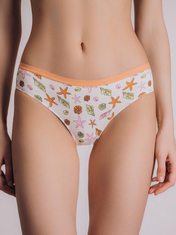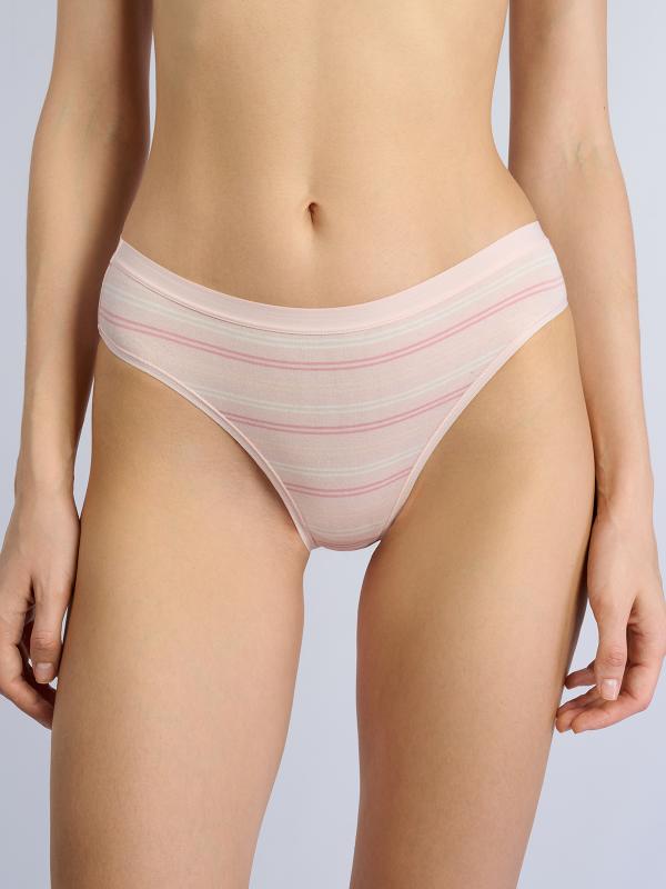 Модель средней посадки держится на мягкой эластичной резинке контрастного персикового цвета, украшенной небольшой декоративной розочкой.