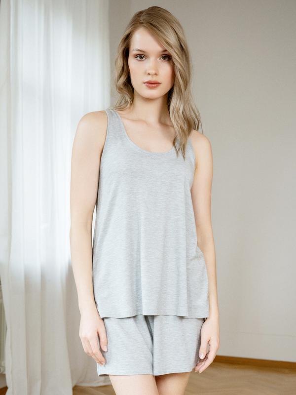 Цвет : Серый Состав : 72% Вискоза, 24% Полиэстер, 4% Эластан Женская пижама Indefini выполнена в светло-сером цвете из мягкой вискозной ткани с добавлением полиэстера и эластана. Комплект состоит из свободной майки на широких бретелях и коротких шорт на мягкой эластичной резинке.