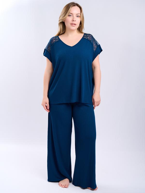 Цвет : Синий Состав : 92% Вискоза 8% Эластан Женская пижама Indefini выполнена в насыщенном синем цвете из мягкой, приятной к телу вискозной ткани с добавлением эластана. Комплект включает в себя стильную топ-майку с V-образным вырезом и декоративными кружевными вставками на плечах, а также свободные широкие брюки на мягкой эластичной резинке.