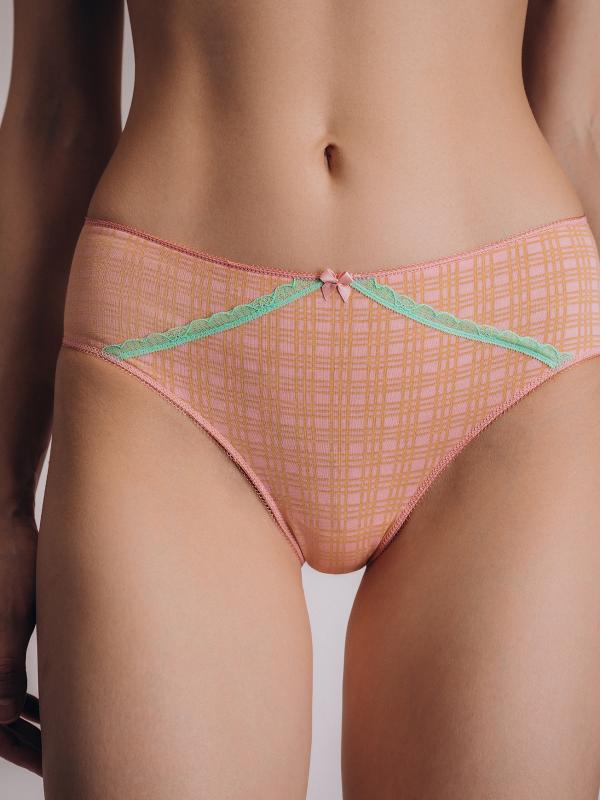 Розово-желтая клетка с контрастной мятной кружевной вставкой и милым бантиком создает ощущение свежести, легкости и радостного настроения — как будто вы надели маленький кусочек летнего сада.