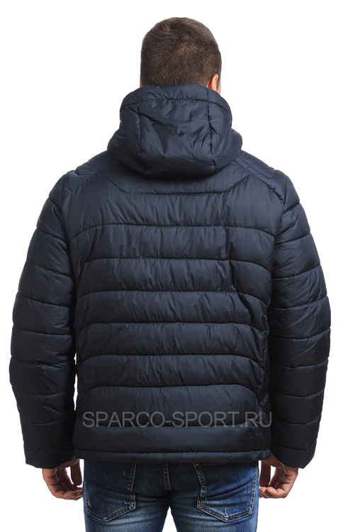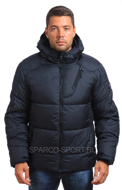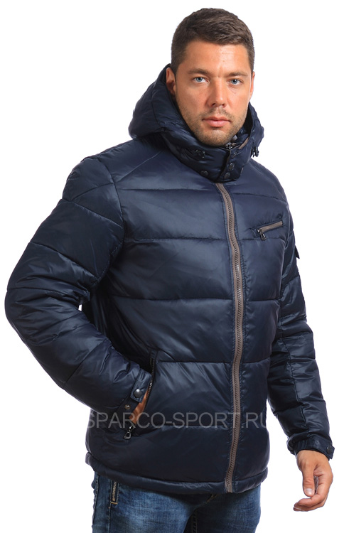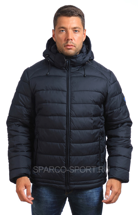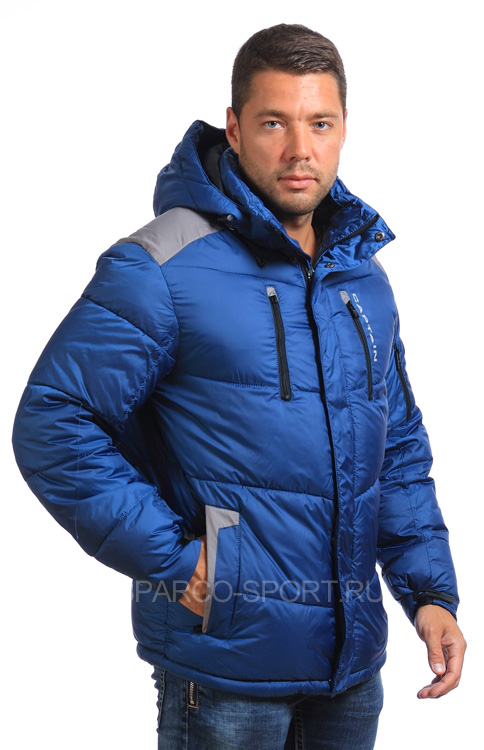 Мужская куртка из смеси хлопка и нейлона имеет полиэстеровую подкладку, наполнитель – тонкий синтепон. Варианты цветов данной модели – синий и красный, с оригинальной отделкой черного цвета на рукавах, поясе и плечах. На куртке две ярких эмблемы. Молния о