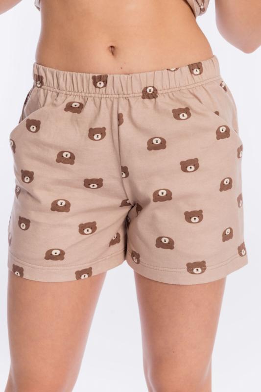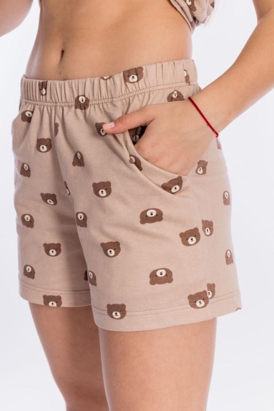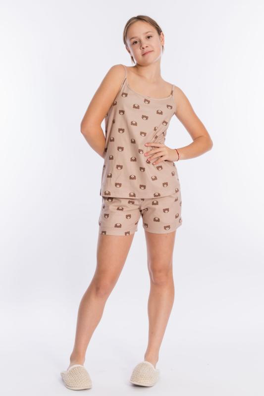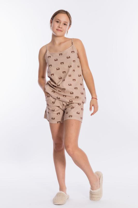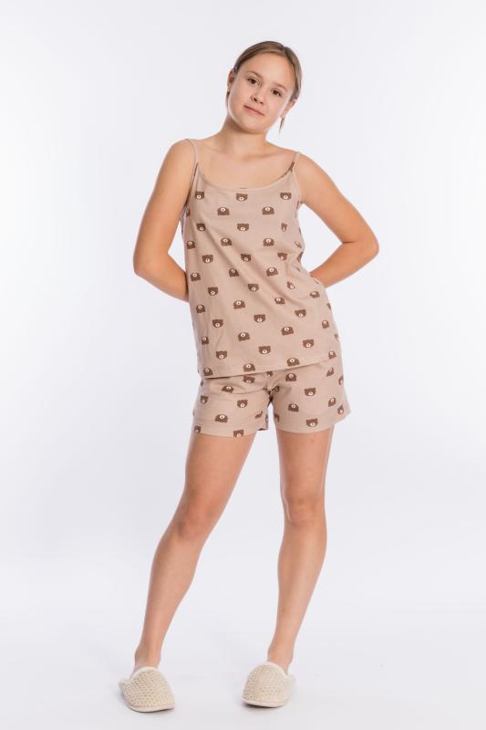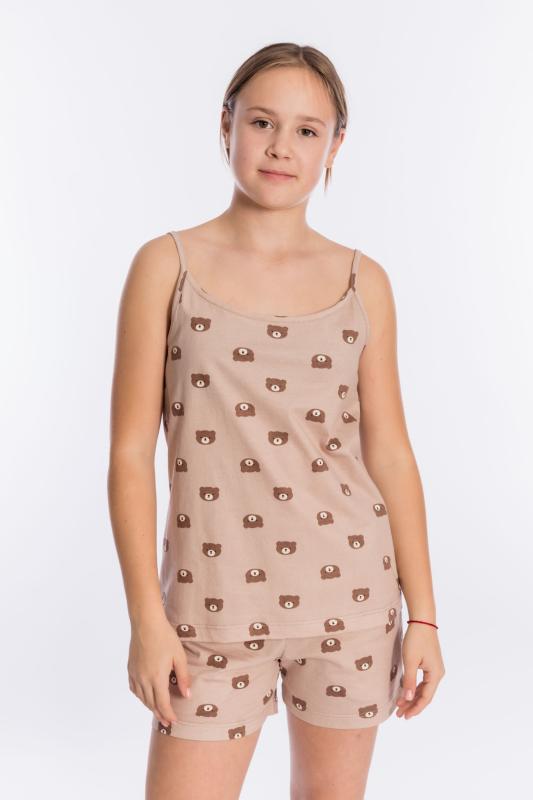 Пижама выполнена из кулирки, 100% хлопок, состоит из топа и шорт. Топ на тонких бретелях, шорты с поясом на резине и карманами по бокам.