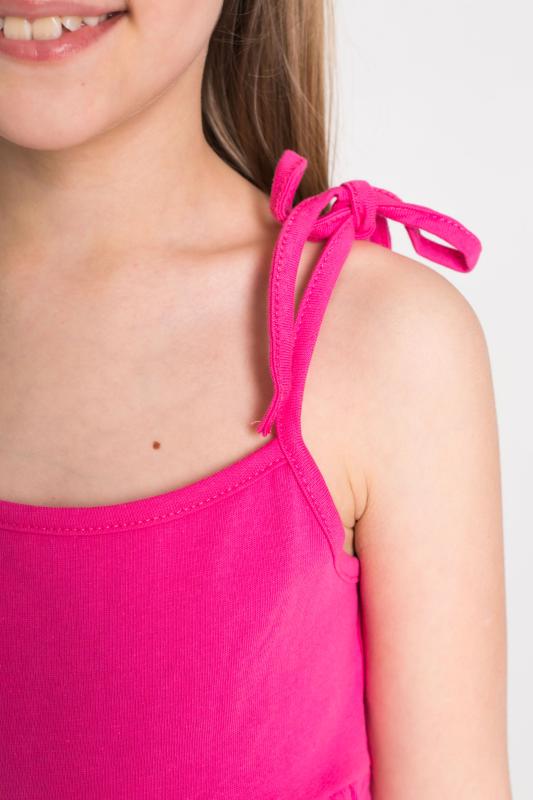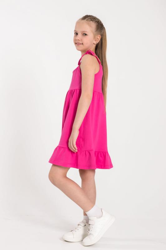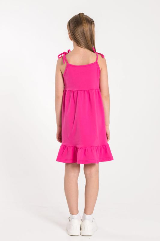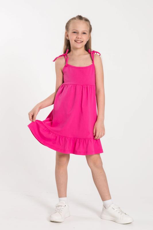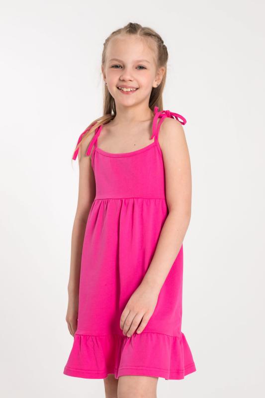 Летний сарафан для девочек с завязывающимися бретелями выполнен из кулирки. К лифу притачана юбка с широкой оборкой по низу.