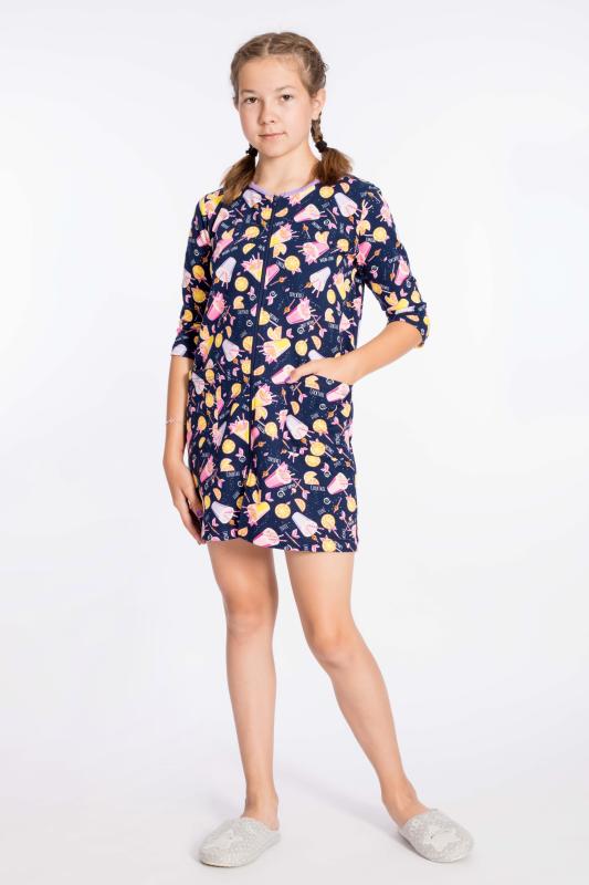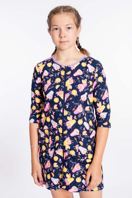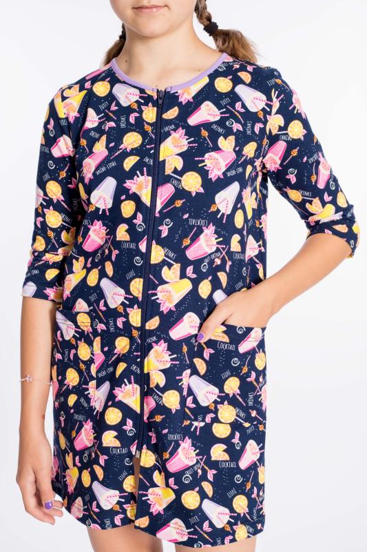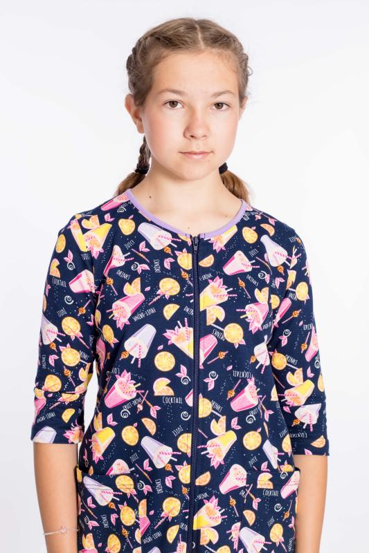 Халат для девочки выполнен из хлопкового полотна. Центральная застёжка на молнию, детали халата обработаны бейкой контрастного цвета. По бокам размещены карманы.