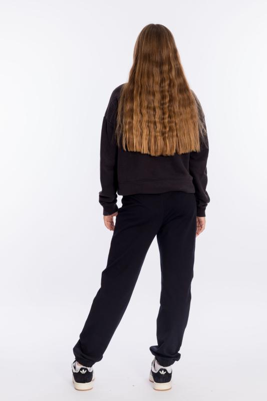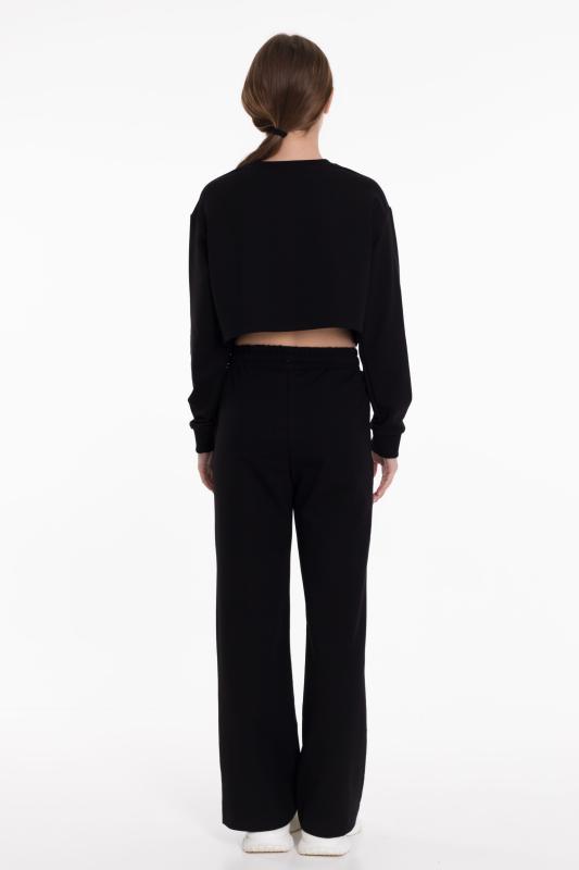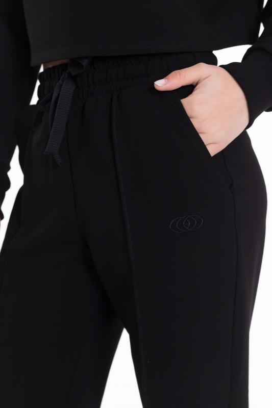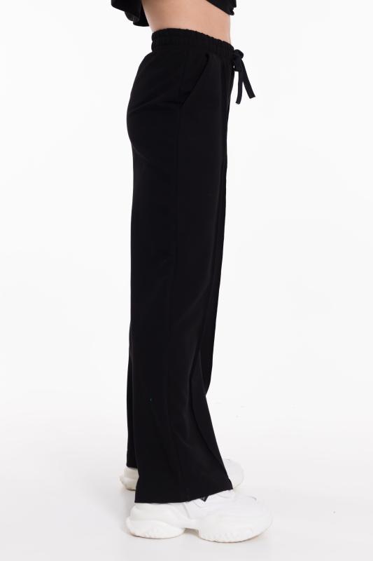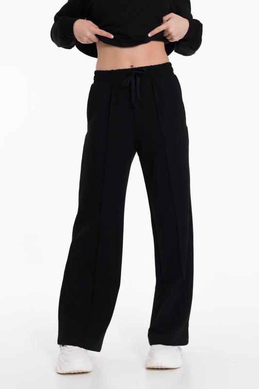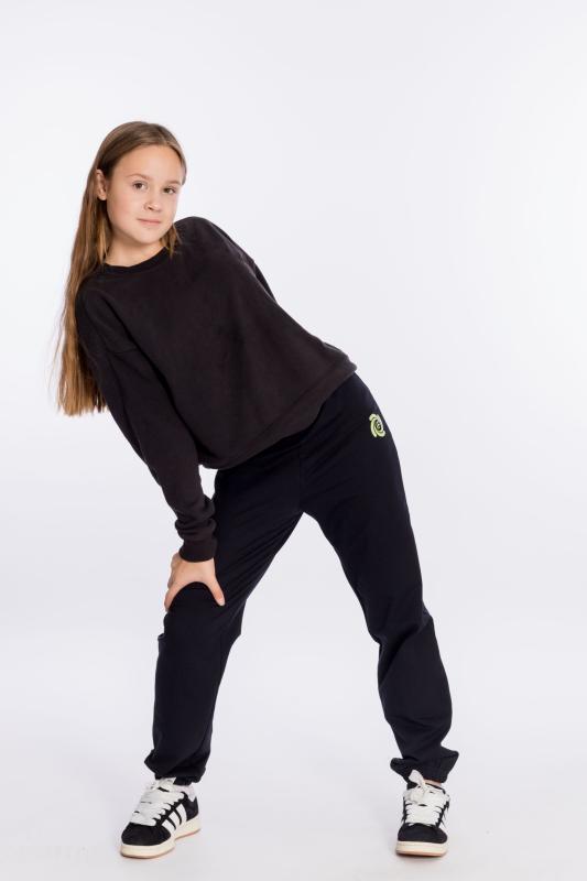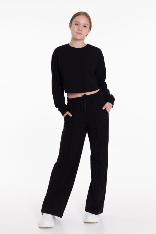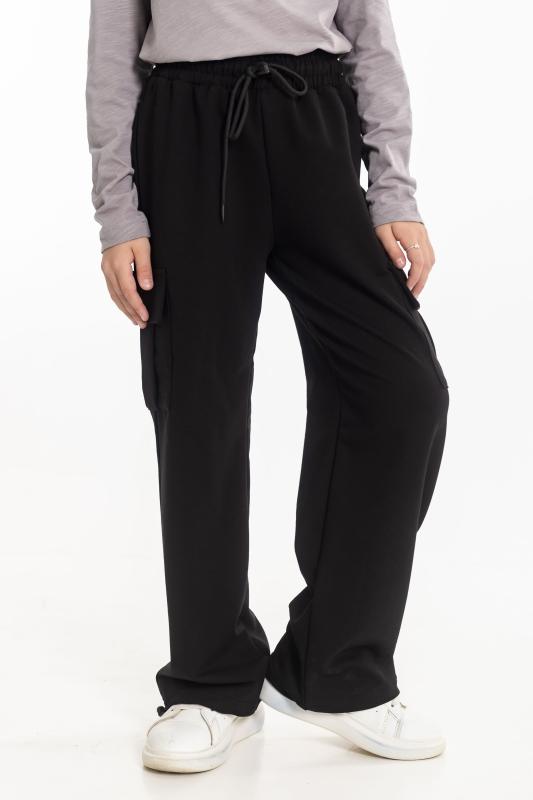 Брюки для девочки из футера 2х нитки черного цвета - стильный и удобный выбор. Свободный крой и пояс на резинке со шнуром обеспечат комфортную посадку и свободу движений. Наличие боковых карманов добавляет функциональности, позволяя хранить мелочи или просто удобно располагать руки. Стрелки спереди на штанинах создают интересный и модный вид. Вышивка на левом кармане в виде логотипа ТД "