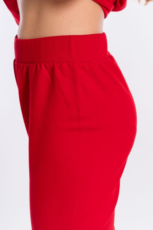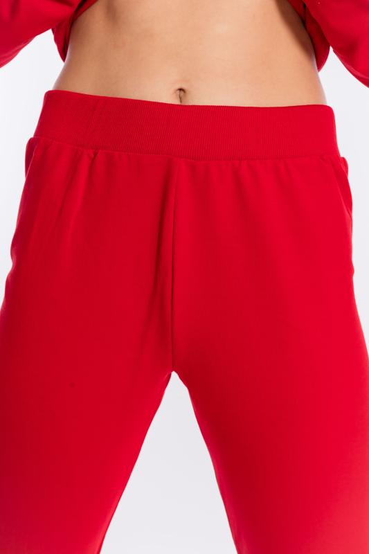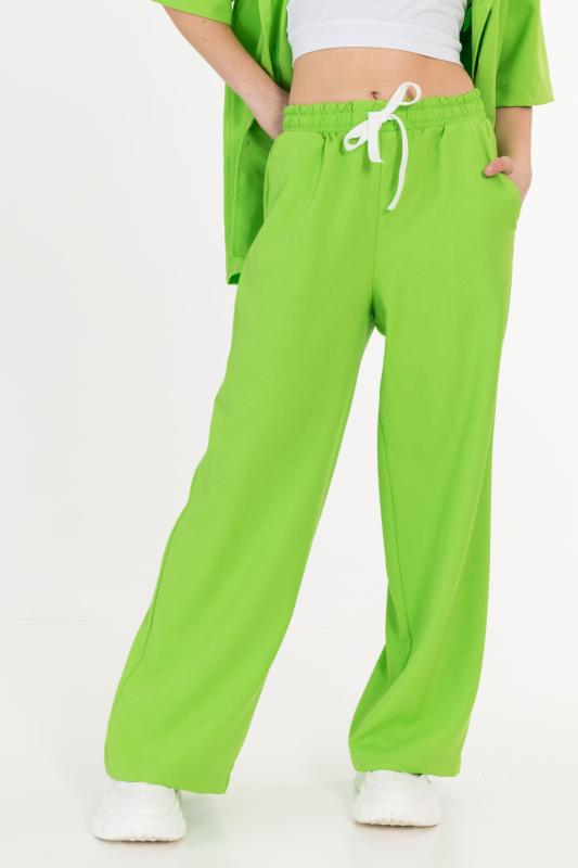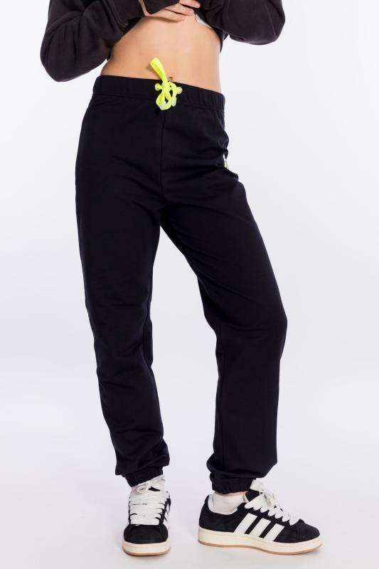 Брюки выполнены из однотонного футера с лайкрой. Пояс и низ брюк на резинке. В поясе через люверсы проложен декоративный шнур, с левой стороны на брюках нанесён термопринт.