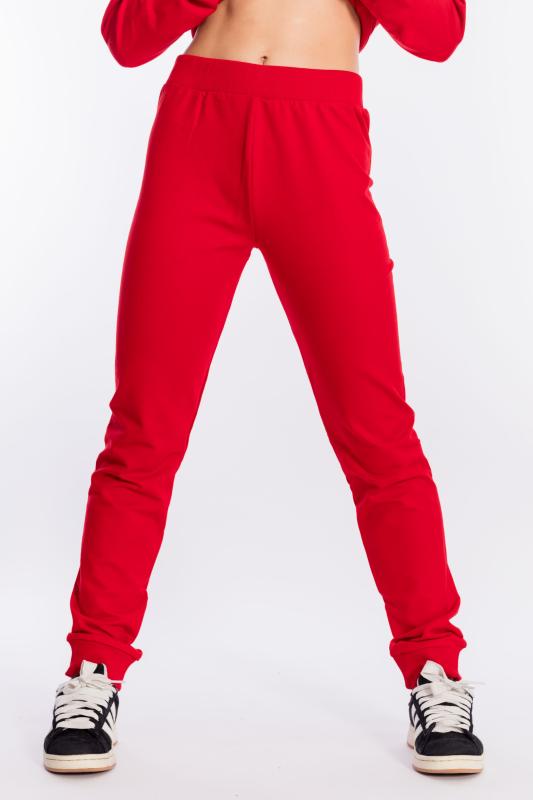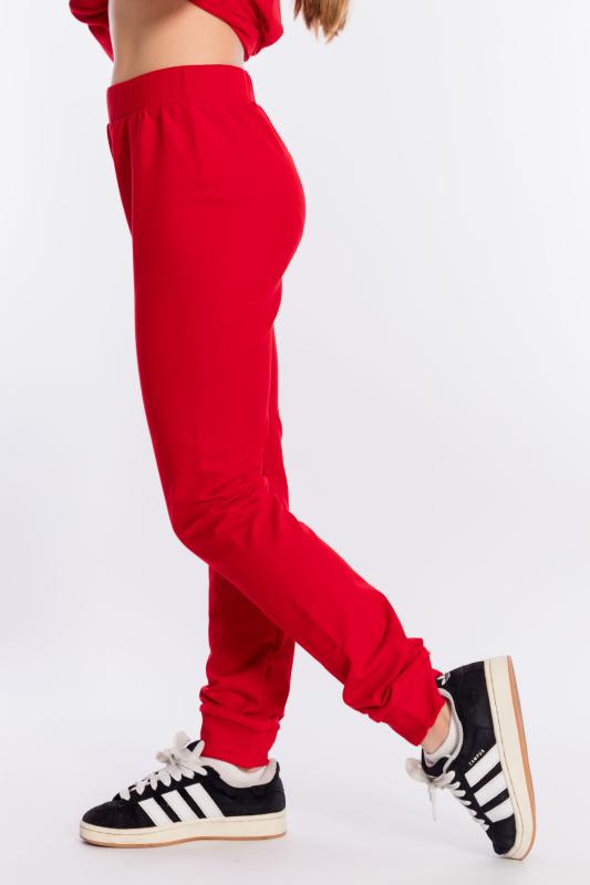 Брюки из однотонного футера с лайкрой. Пояс на резине, по бокам размещены карманы. Низ брюк оформлен манжетами. Сзади на брюках нанесён термопринт.