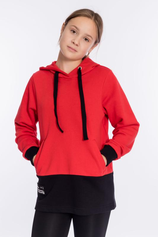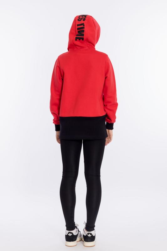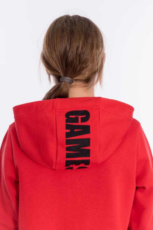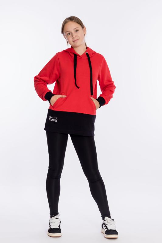 Толстовка выполнена из футера трёхнитки (воздушка). На вставке капюшона нанесён принт, через люверсы проложен шнур. По бокам расположены карманы, справа настрочена нашивка. Длинный рукав заканчивается манжетом из кашкорсе.