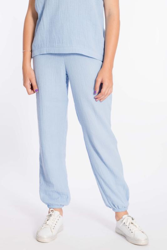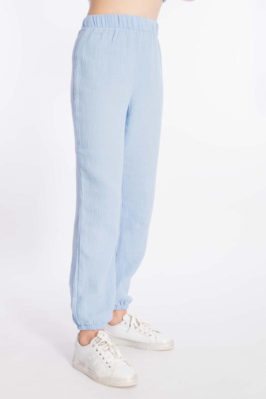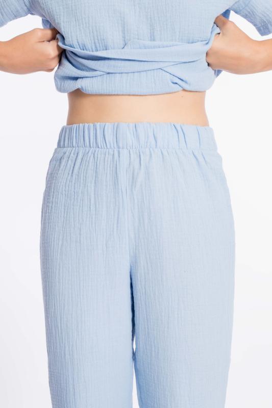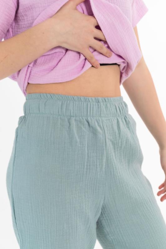 Детские летние брюки выполнены из муслина. Пояс и низ брюк на резинке.