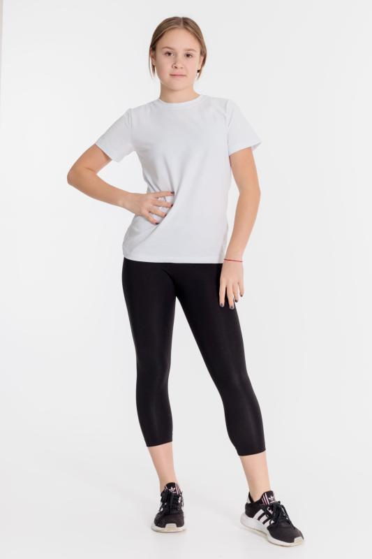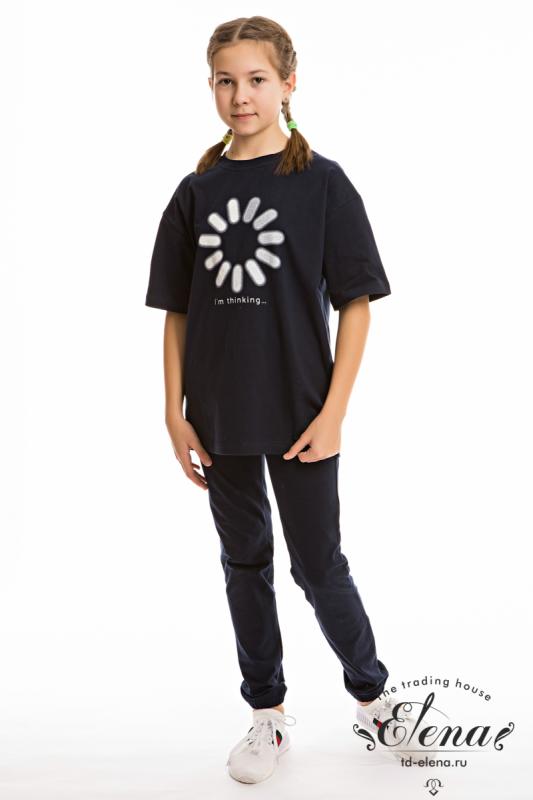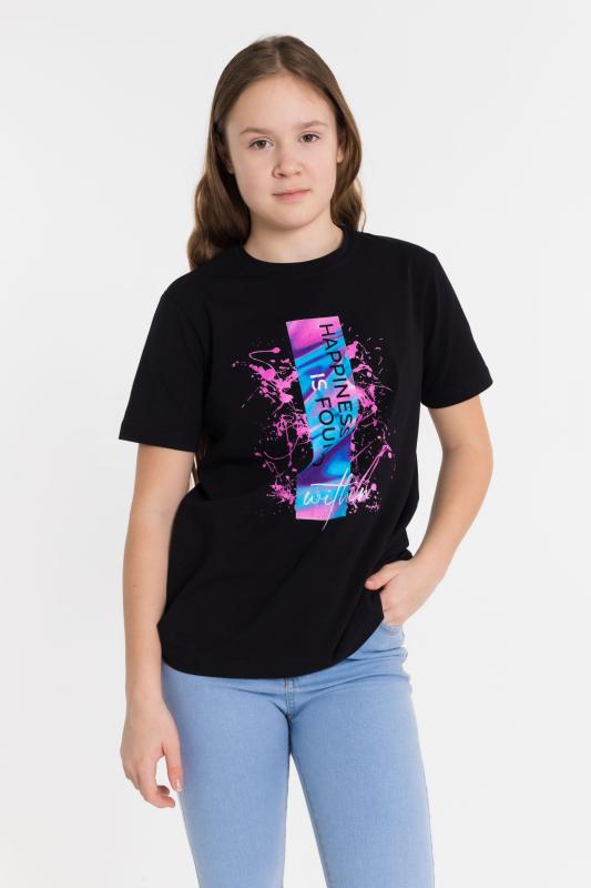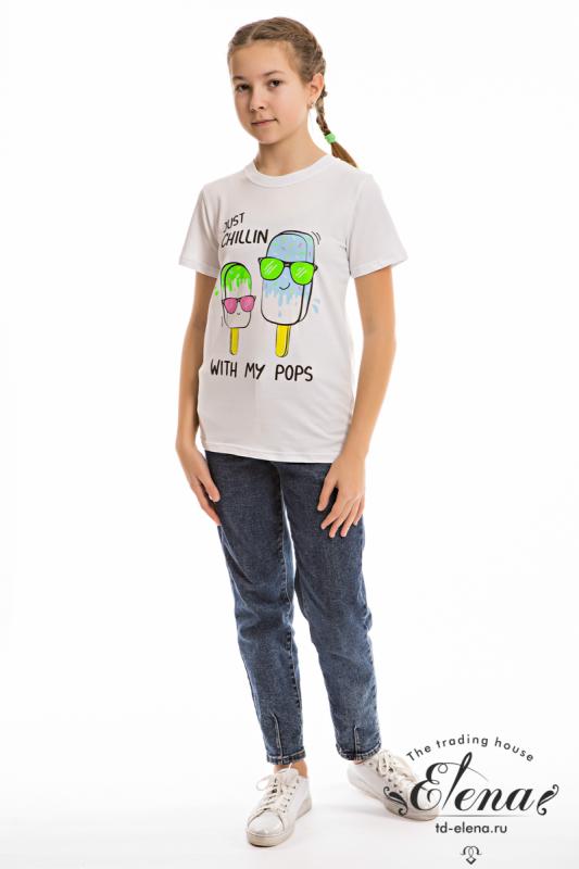 Футболка из однотонной кулирки с лайкрой. Круглый вырез горловины, втачной рукав, на полочке принт. Размерный ряд: 28-98-42-164