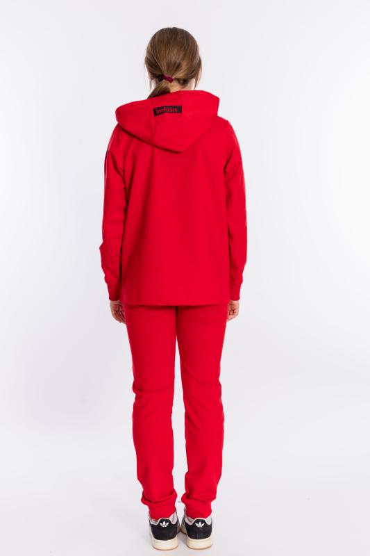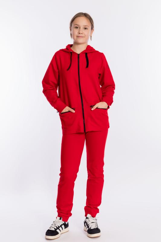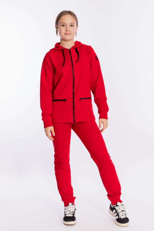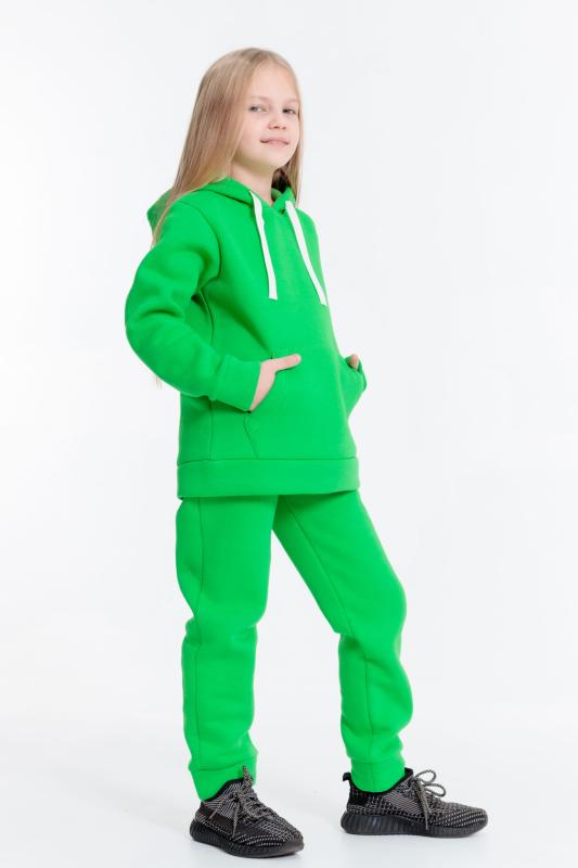Костюм выполнен из однотонного полотна с начёсом, состоит из брюк и толстовки. Толстовка с карманом-кенгуру, ширина капюшона регулируется при помощи шнура, длинные рукава заканчиваются манжетами. Брюки с поясом на резине, низ на манжетах.