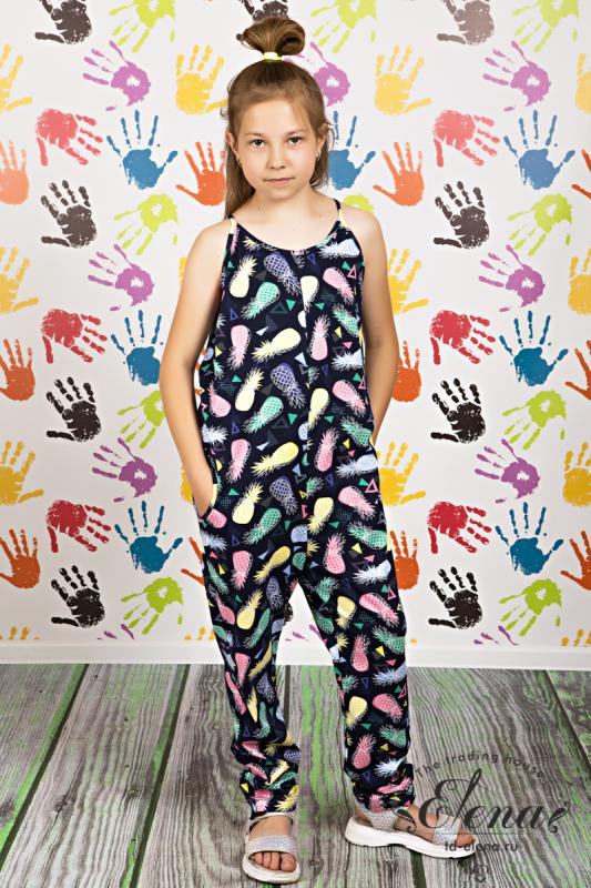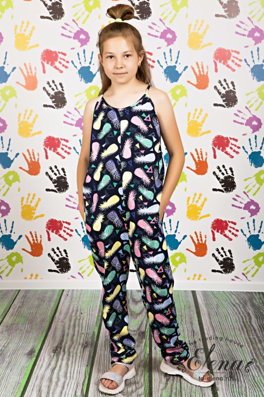 Комбинезон для девочки выполнен из х-б полотна. В боковых швах расположены карманы. Бретельки регулируются сзади, в кулиске спинки.