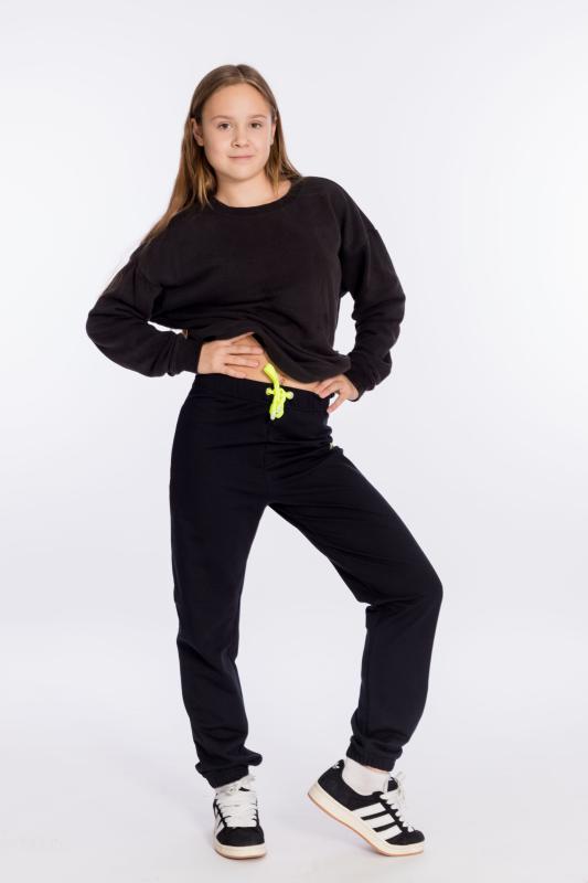 Брюки для девочки из флиса черного цвета. Брюки прямого кроя с поясом на резинке и шнуре обеспечивают комфортную посадку и не сковывают движения. Манжеты на резинке по низу штанин защитят от холода. Боковые карманы делают модель более функциональной и удобной. Такие брюки идеально подойдут для прогулок на свежем воздухе.