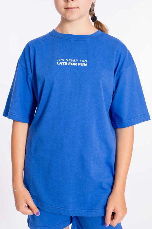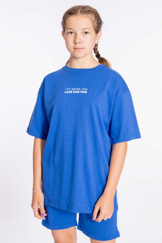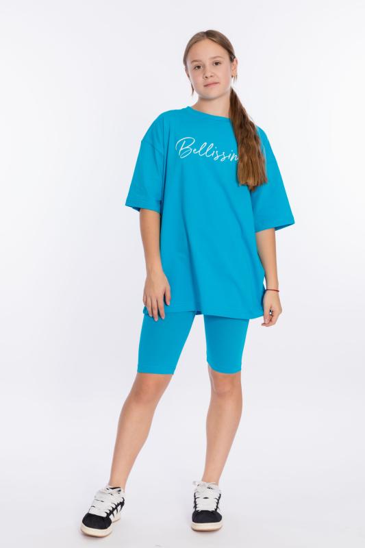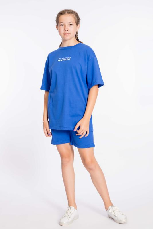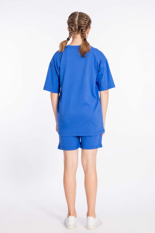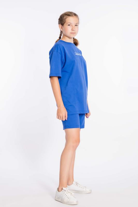 Модный костюм для девочки выполнен из мягкой и приятной к телу ткани — кулирки (100% хлопок). Он состоит из свободных шорт и футболки, что обеспечивает комфорт и свободу движений. Футболка имеет короткий втачной рукав и украшена принтом спереди. Шорты слегка расширены, есть боковые карманы и притачной пояс на резинке. Костюм выполнен в однотонном цвете василек, что позволяет сочетать его с различными элементами гардероба.
