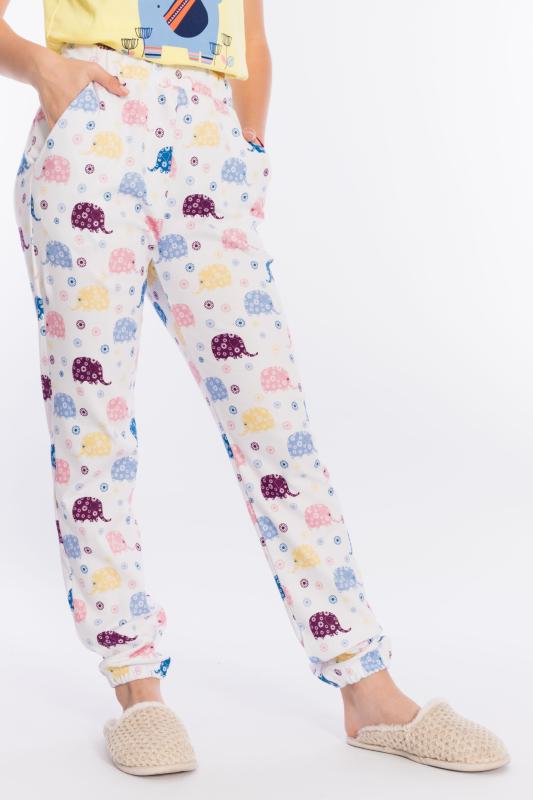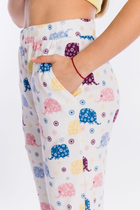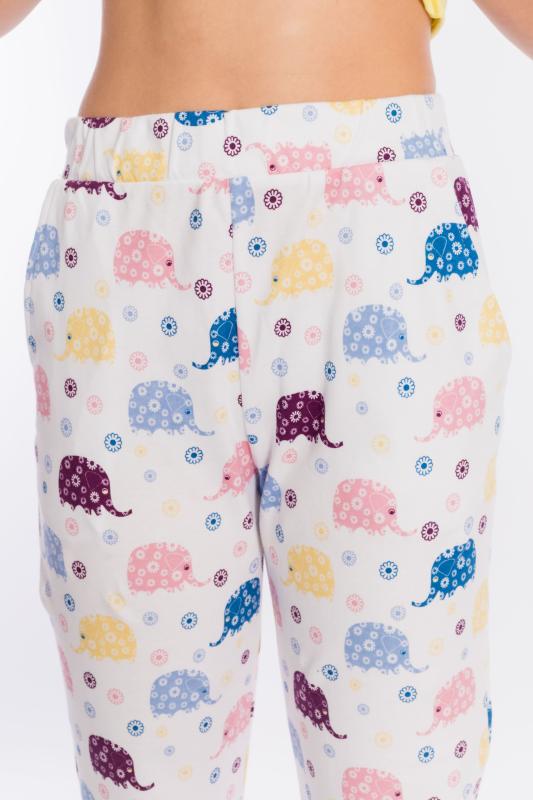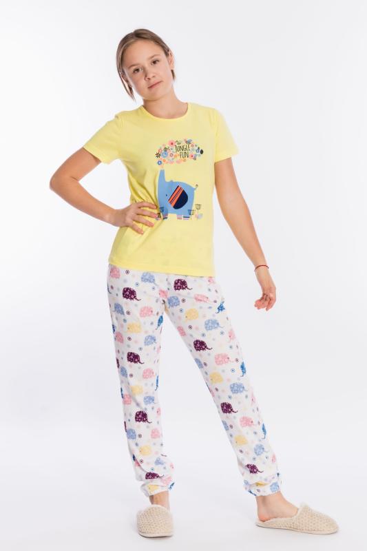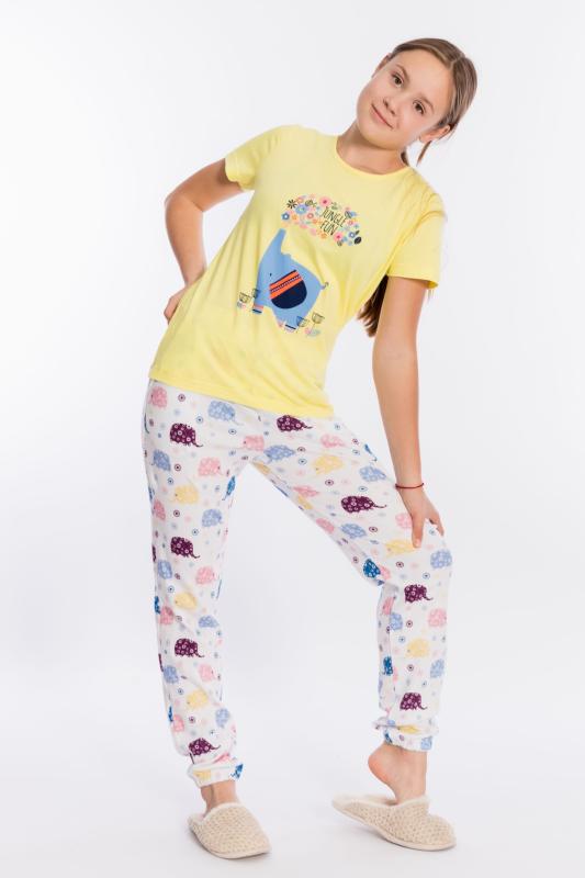 Костюм выполнен из хлопкового полотна, состоит из футболки и брюк. Футболка однотонная, с коротким рукавом, горловина с круглым вырезом обработана бейкой. Спереди расположен принт. Брюки из полотна с набивным рисунком, с боковыми карманами. Пояс и низ брюк на резинке.