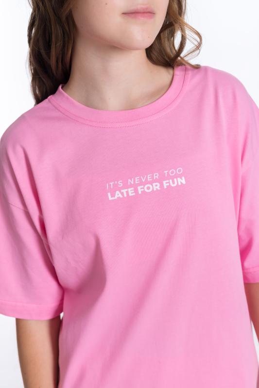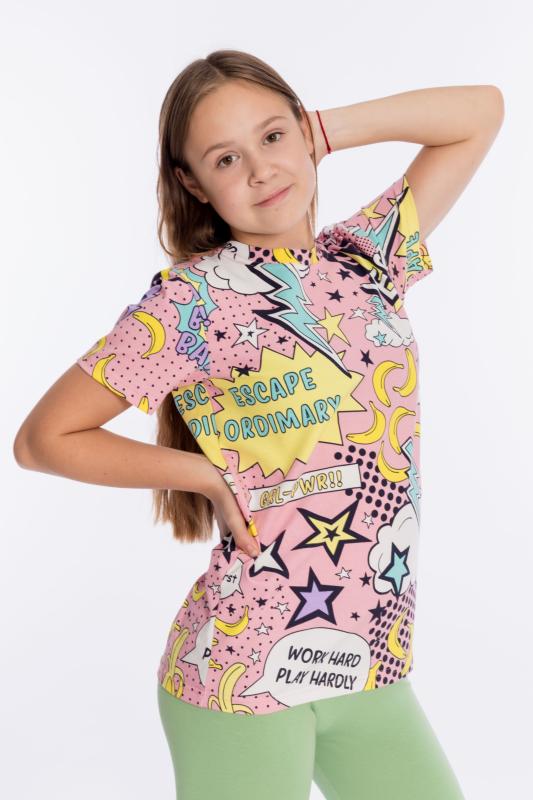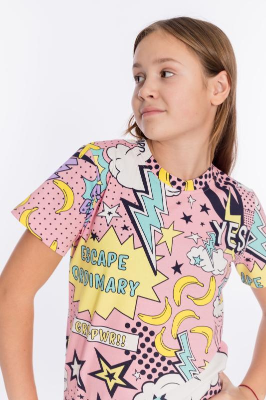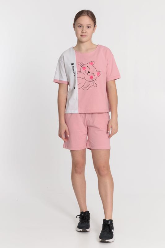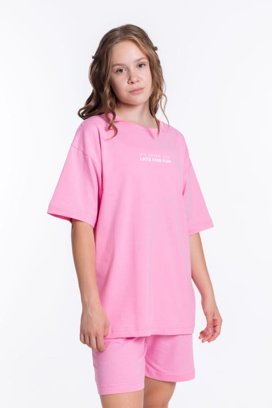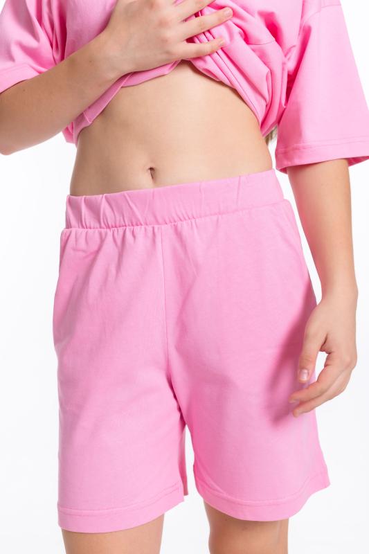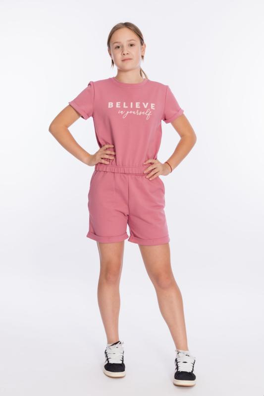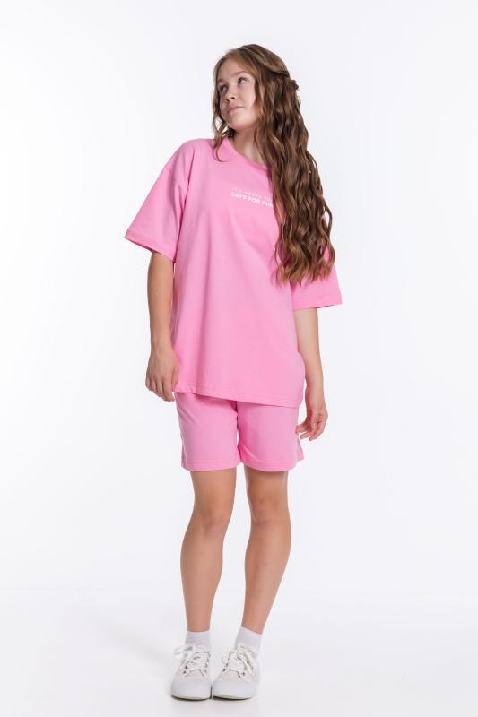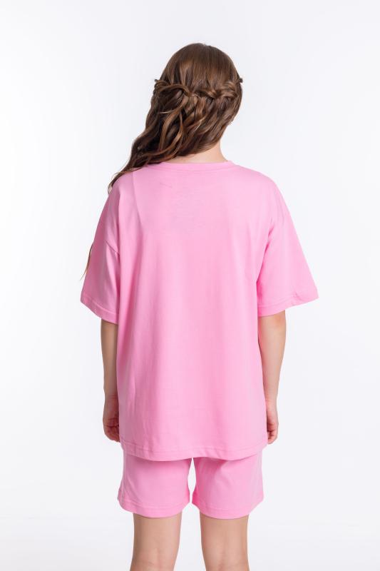 Модный костюм для девочки выполнен из мягкой и приятной к телу ткани — кулирки (100% хлопок). Он состоит из свободных шорт и футболки, что обеспечивает комфорт и свободу движений. Футболка имеет короткий втачной рукав и украшена принтом спереди. Шорты слегка расширены, есть боковые карманы и притачной пояс на резинке. Костюм выполнен в однотонном розовом цвете, что позволяет сочетать его с различными элементами гардероба.