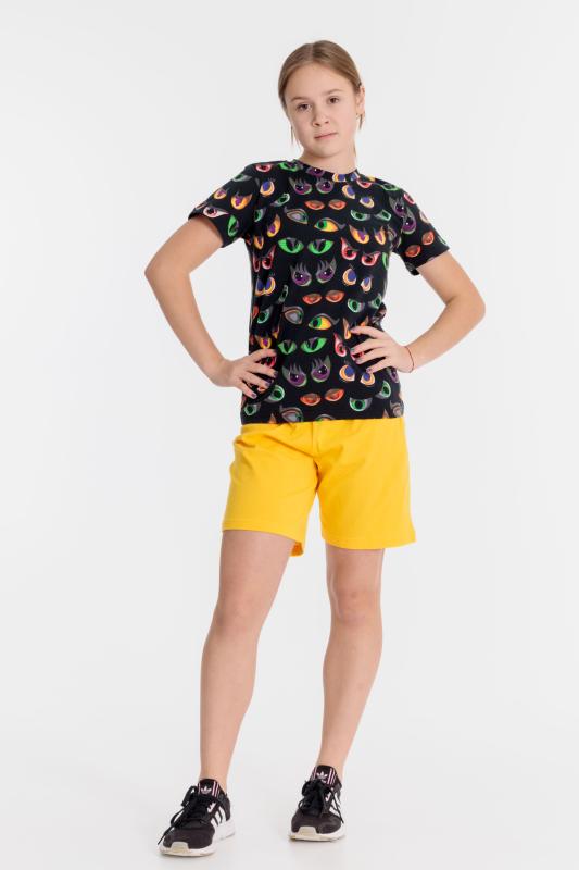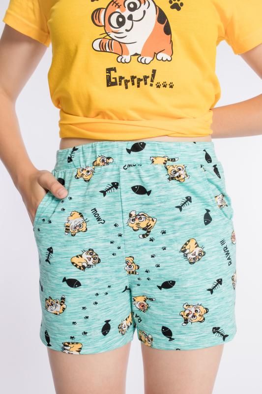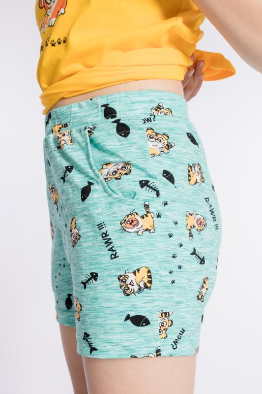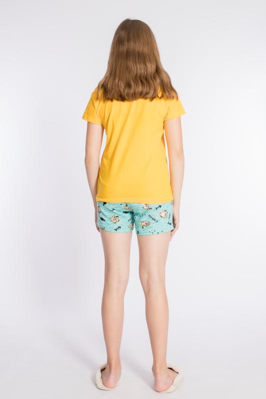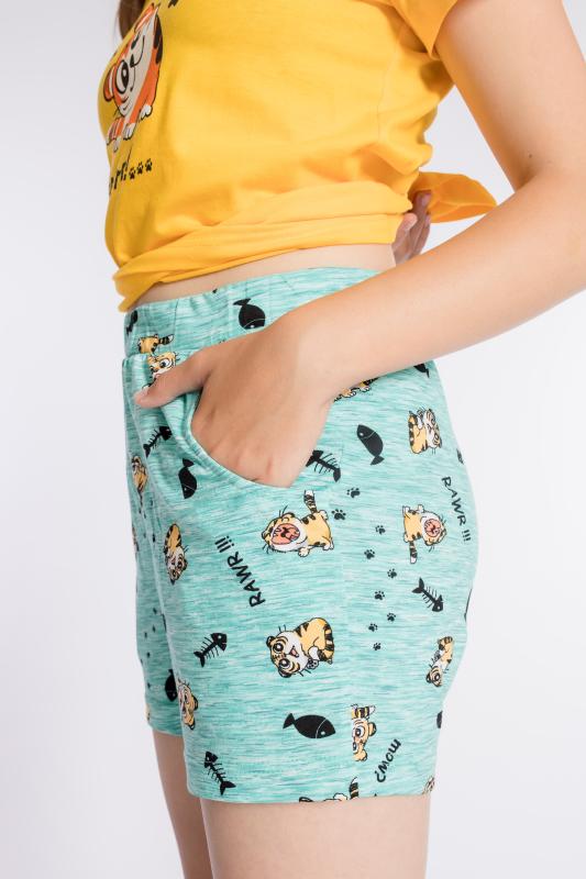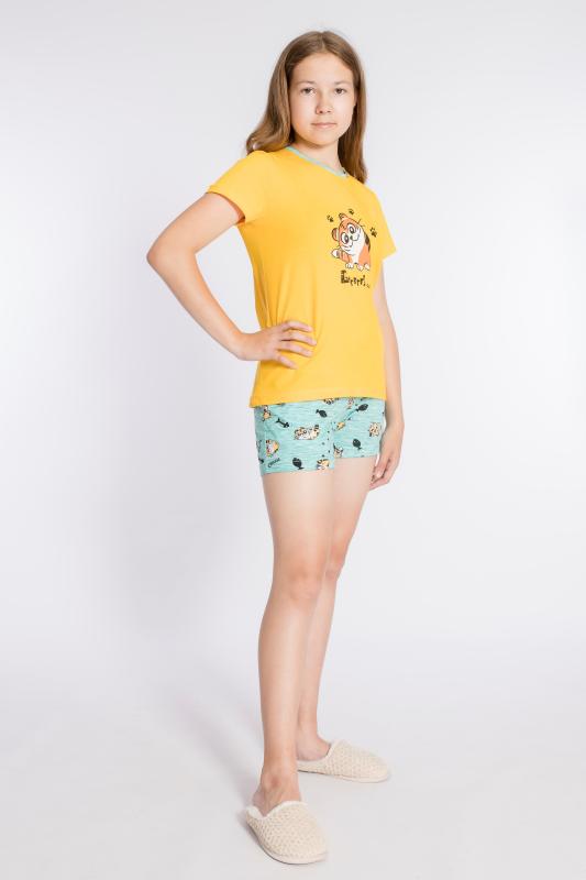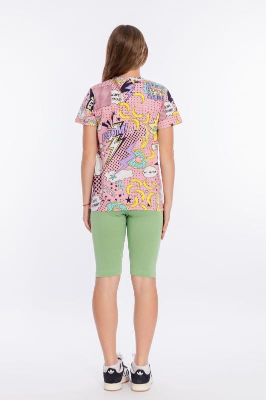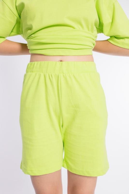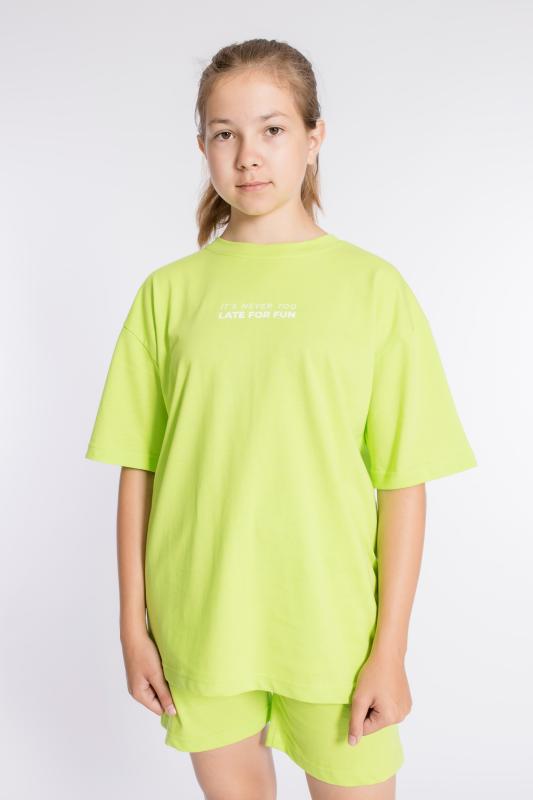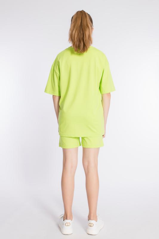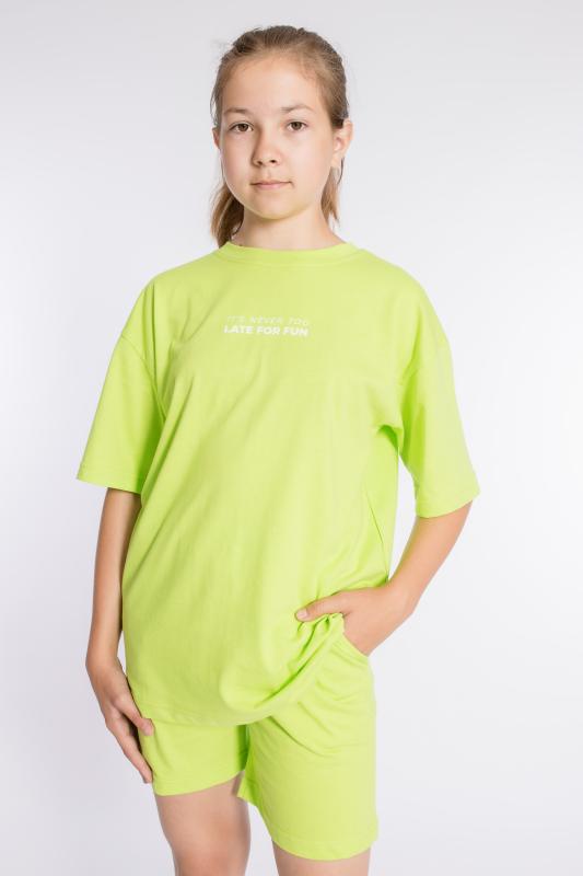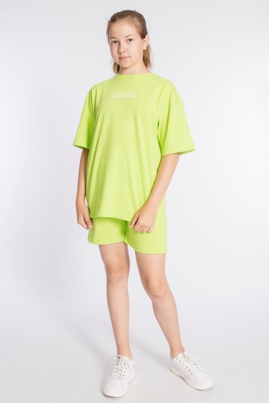 Модный костюм для девочки выполнен из мягкой и приятной к телу ткани — кулирки (100% хлопок). Он состоит из свободных шорт и футболки, что обеспечивает комфорт и свободу движений. Футболка имеет короткий втачной рукав и украшена принтом спереди. Шорты слегка расширены, есть боковые карманы и притачной пояс на резинке. Костюм выполнен в однотонном салатовом цвете, что позволяет сочетать его с различными элементами гардероба.