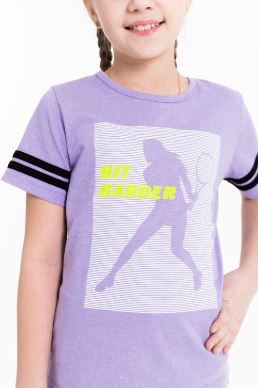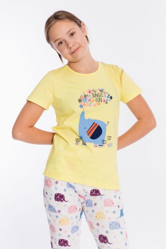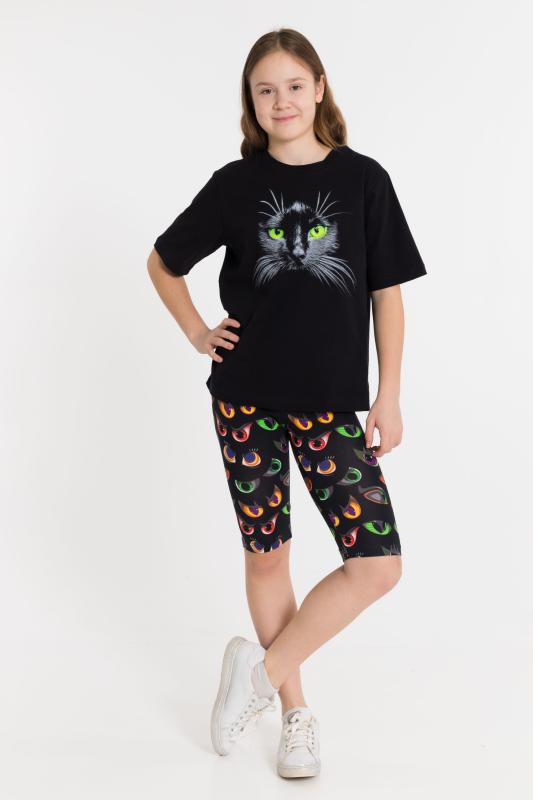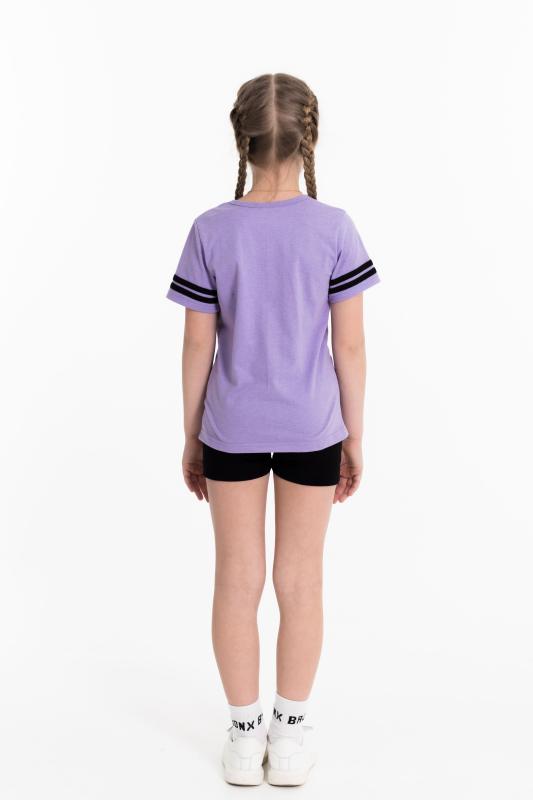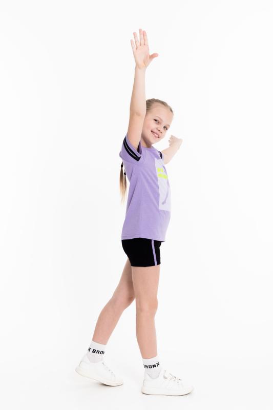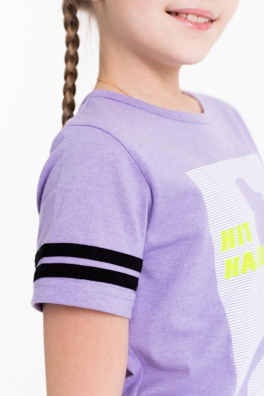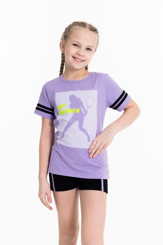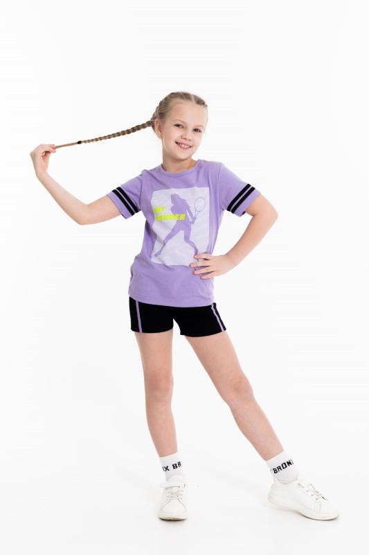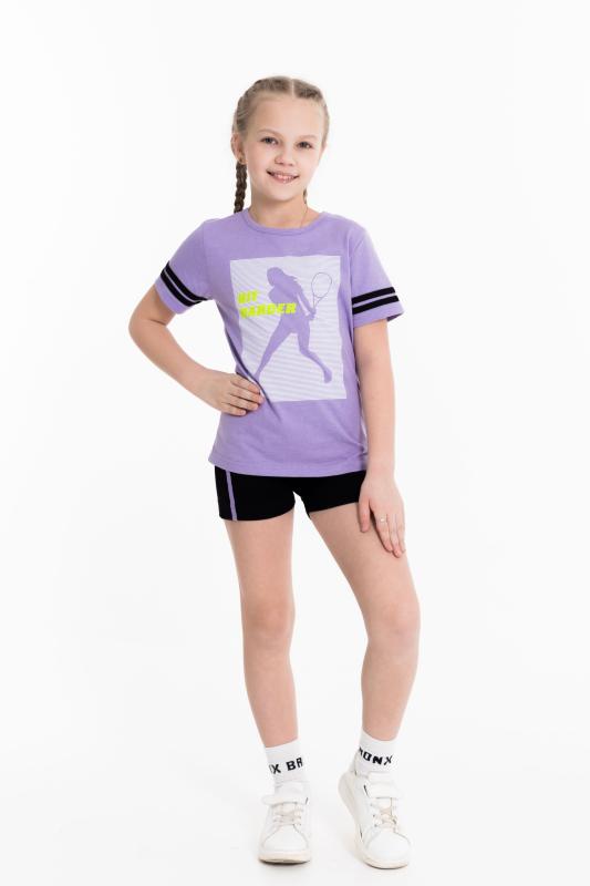 Костюм выполнен из однотонной кулирки с лайкрой, состоит из футболки свободного силуэта и велосипедок. Футболка с коротким втачным рукавом и принтом спереди. Велосипедки с притачным поясом на резине.