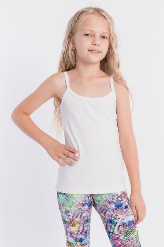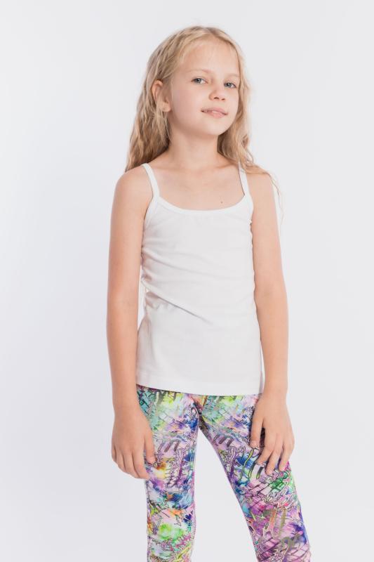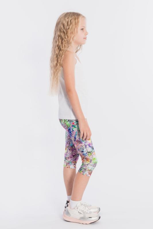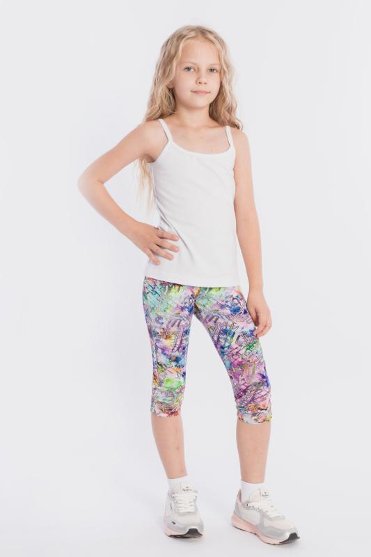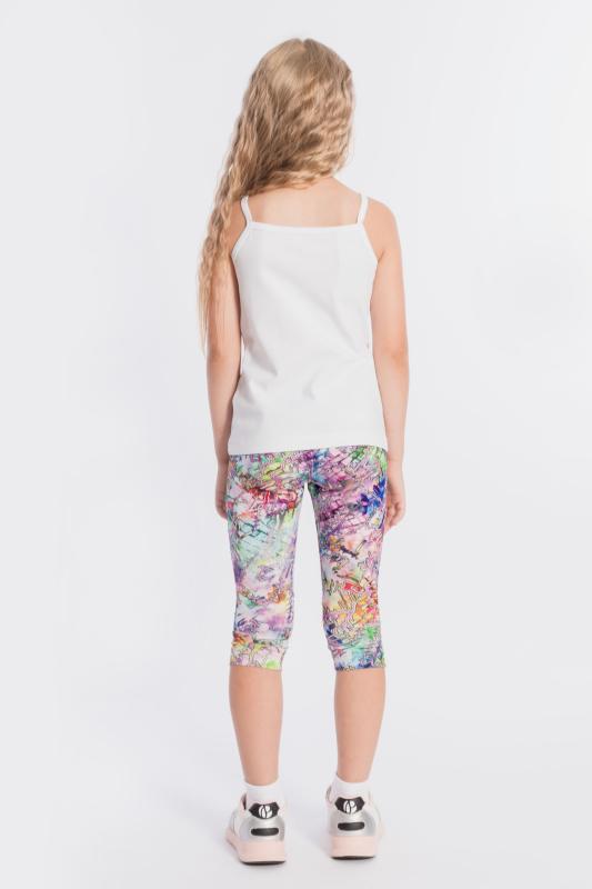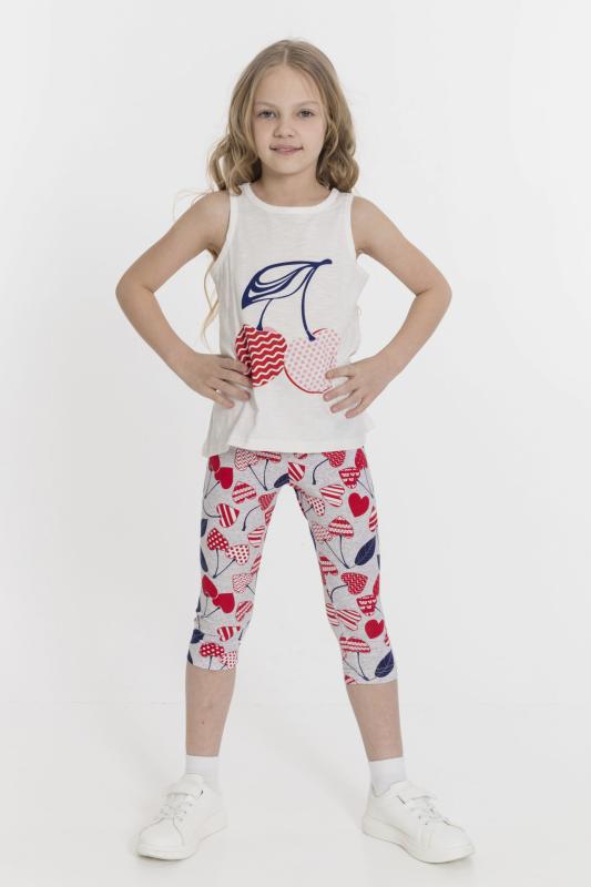 Костюм для девочек выполнен из двух видов полотна - майка из кулирки фламли, а капри из х-б полотна с содержанием лайкры. Майка с круглым вырезом горловины и принтом спереди, низ разноуровневый. Капри с поясом на резине.