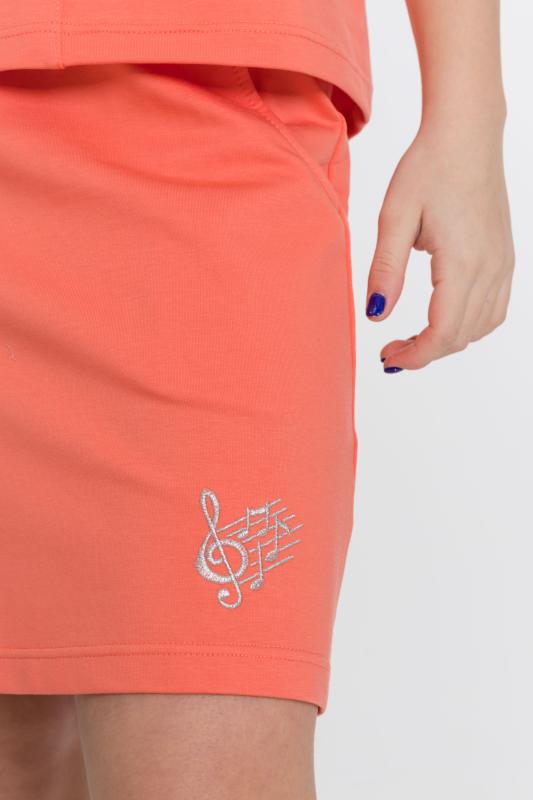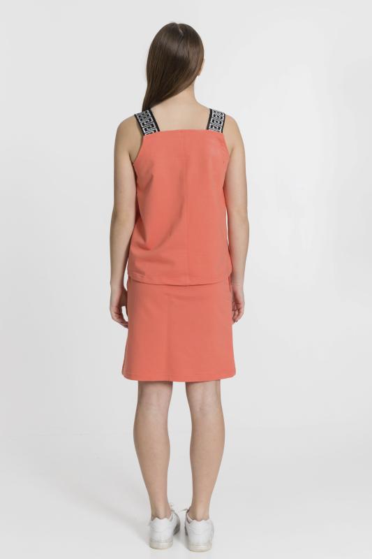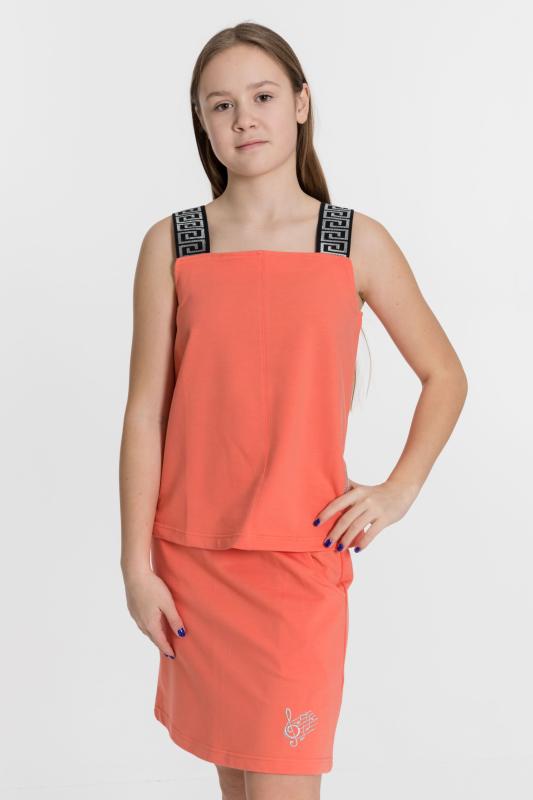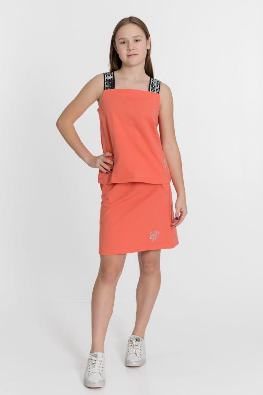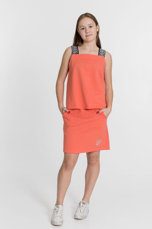 Костюм выполнен из однотонного футера с лайкрой, состоит из юбки и топа. Юбка прямая, с боковыми карманами и поясом на резине. Топ слегка расклешенный, с декоративными бретелями. На топе и юбке вышивка.