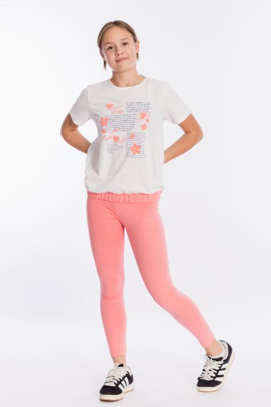 Костюм для девочки состоит из лосин и футболки. Лосины выполнены из тёмной кулирки с лайкрой, футболка из кулирки, 100% хлопок, комбинированная: тёмная спинка, перед белый. Футболка с коротким спущенным рукавом, спинка переходящая в кокетку полочки. Спереди нанесён красивый принт.