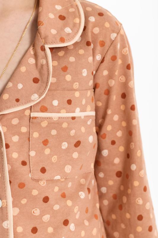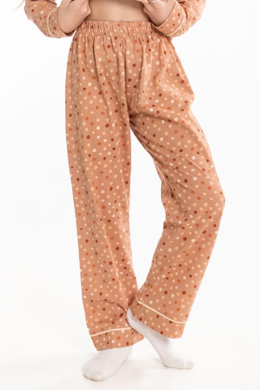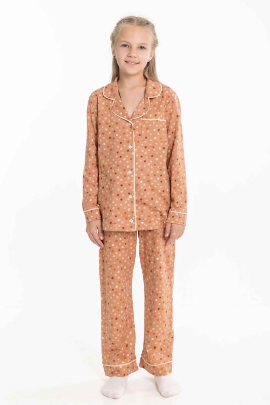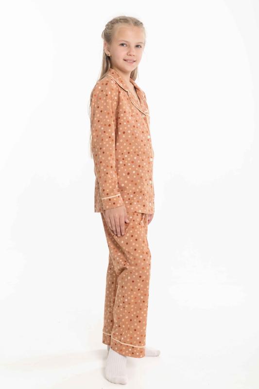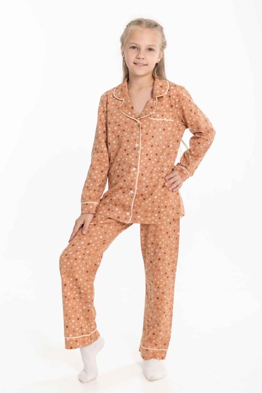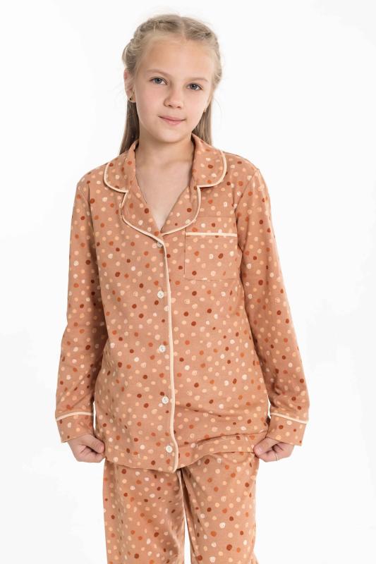Пижама для девочки выполнена из мягкой кулирки. Рубашка с длинным рукавом, воротником и застежкой на пуговицы. На полочке расположен нагрудный карман, все детали оформлены кантом из отделочного полотна. Брюки свободного кроя с поясом на резинке, также декорированы кантом. Модель удобна в носке и идеально подходит для сна и отдыха.
