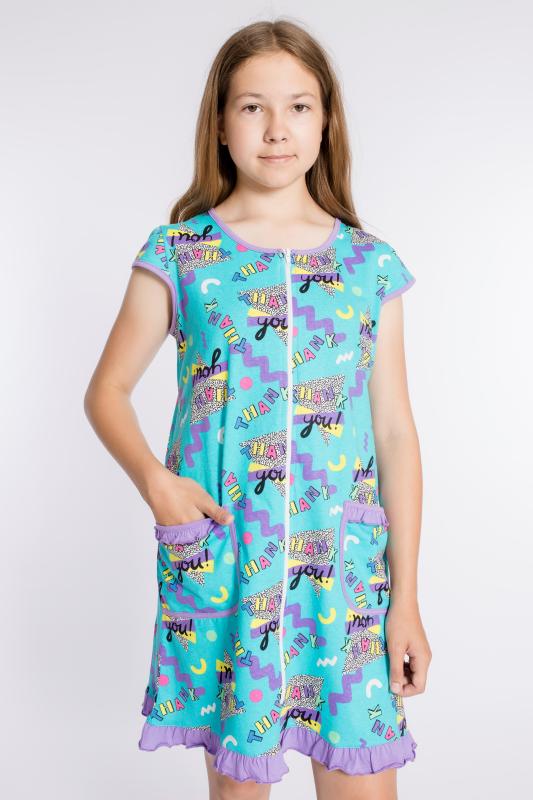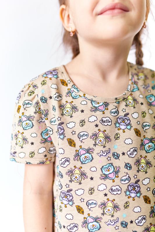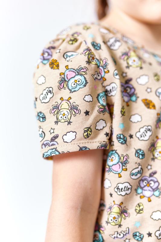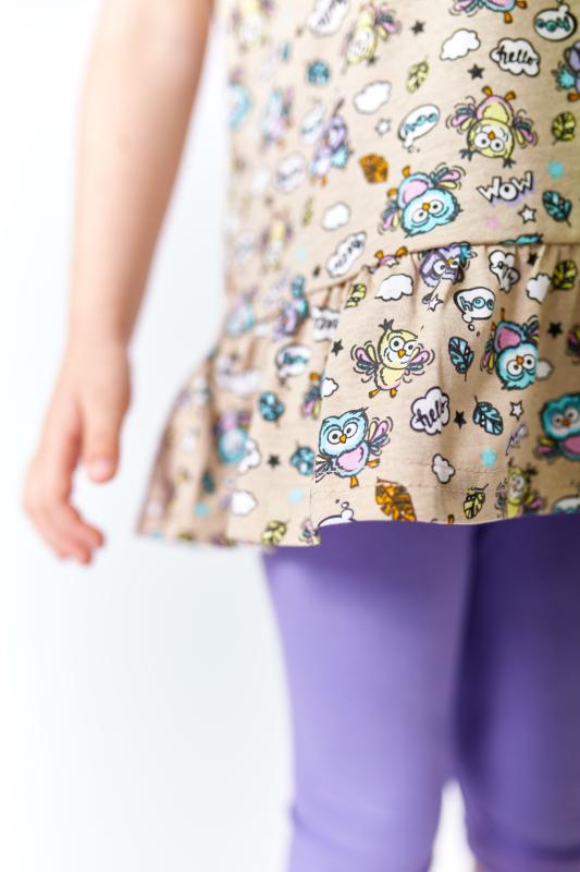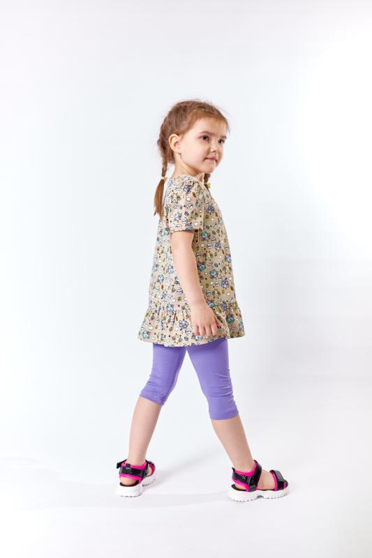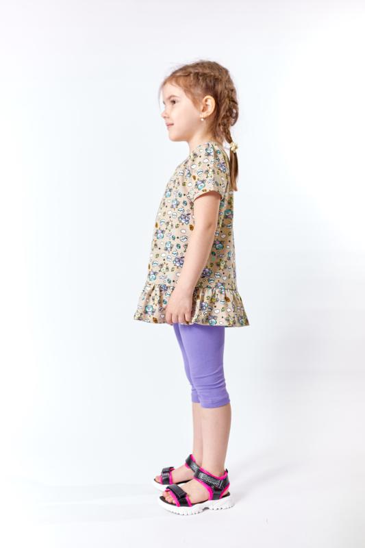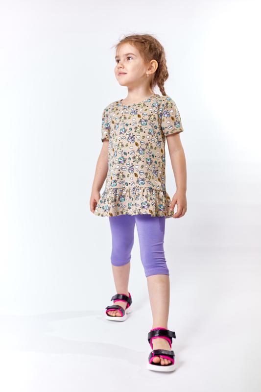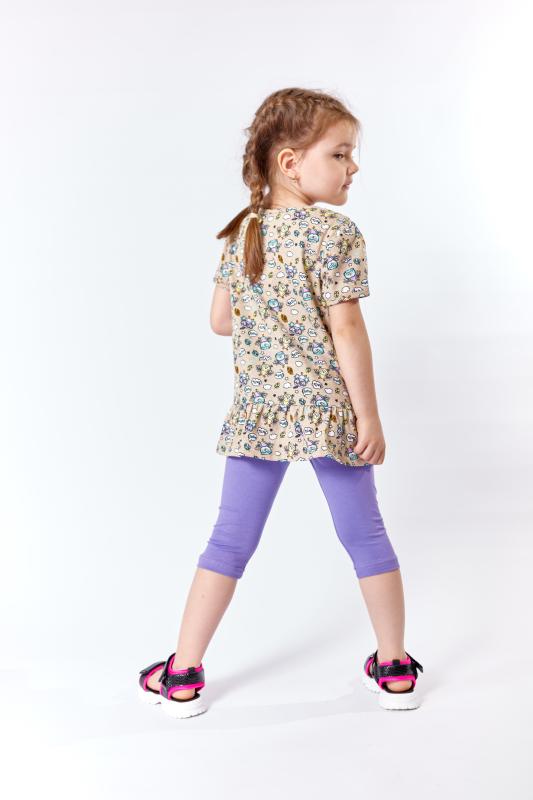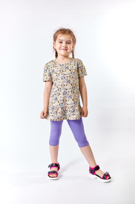Летний костюм для девочки состоит из туники и велосипедок. Туника с коротким рукавом со сборкой, выполнена из кулирки с набивным рисунком. Вырез горловины круглый, по низу туники оборка. Велосипедки из однотонной кулирки с лайкрой, пояс на резинке.