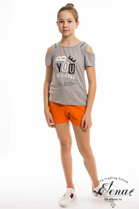 Костюм выполнен из однотонного футера с лайкрой. Футболка с коротким втачным рукавом на манжете, низ на резинке. Спереди нанесён принт. Шорты свободного кроя, с боковыми карманами и притачным поясом на резинке. Низ шорт оформлен отворотами.
