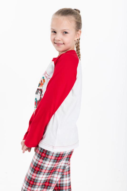 Детская пижама новогодняя - лонгслив и брюки, изготовлена из мягкого и приятного к телу хлопкового полотна. Лонгслив прямого кроя, рукава реглан, перед и спинка белого цвета, спереди нанесён принт. Круглый вырез горловины отделан бейкой красного цвета. Брюки прямого кроя из кулирки с набивным рисунком в клетку, пояс на резинке. Изготовленная из натуральной ткани, пижама обеспечит комфорт в течение всего дня.