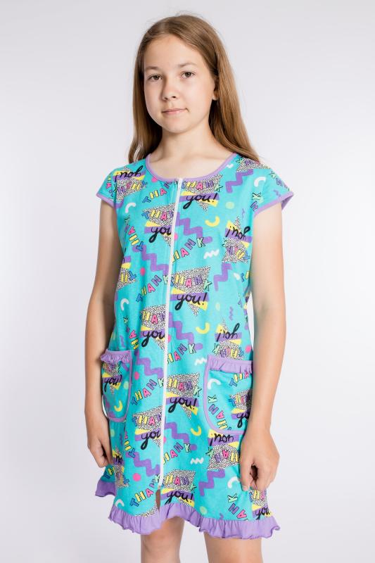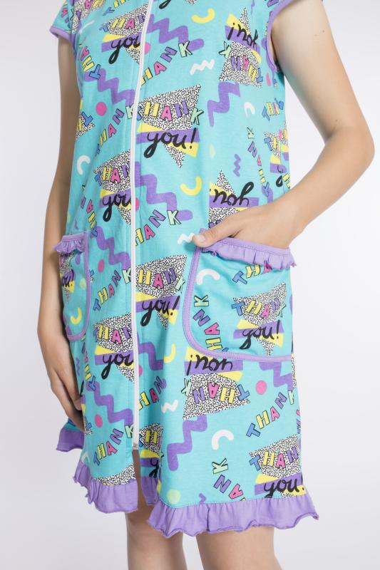 Халат выполнен из хлопкового полотна с набивным рисунком. Спереди застёжка на молнию и карманы. Низ халата и карманы украшены рюшами.