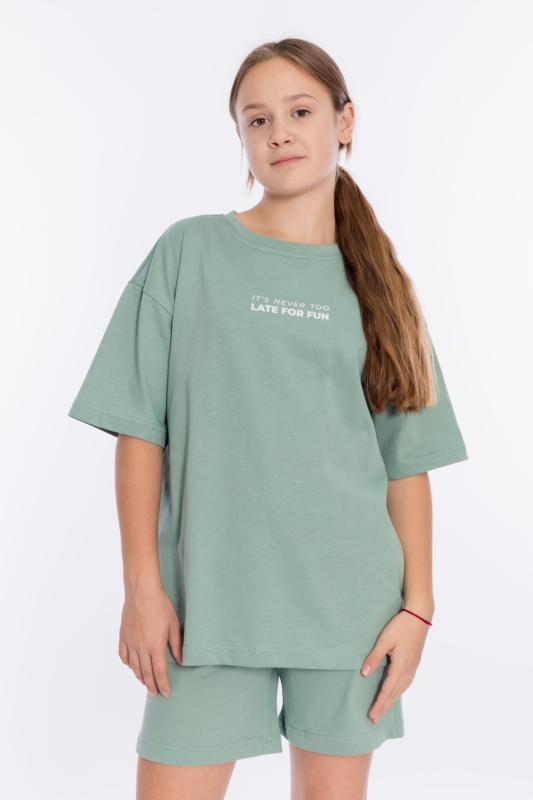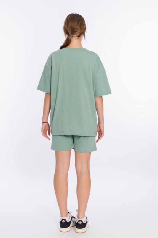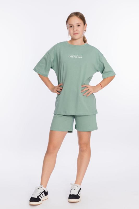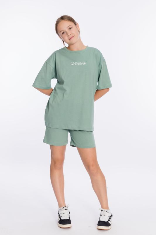 Модный костюм для девочки выполнен из мягкой и приятной к телу ткани — кулирки (100% хлопок). Он состоит из свободных шорт и футболки, что обеспечивает комфорт и свободу движений. Футболка имеет короткий втачной рукав и украшена принтом спереди. Шорты слегка расширены, есть боковые карманы и притачной пояс на резинке. Костюм выполнен в однотонном цвете полынь, что позволяет сочетать его с различными элементами гардероба.