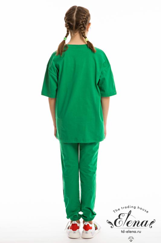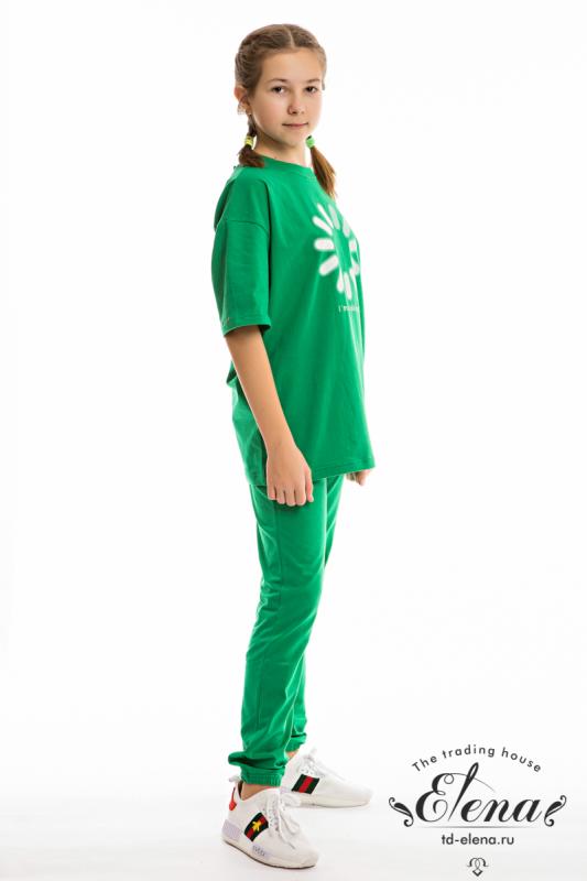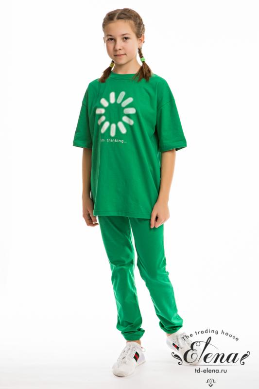 Костюм выполнен из однотонной кулирки с лайкрой, состоит из футболки и брюк. Футболка свободного силуэта, со спущенной линией плеча. Пояс и низ брюк на резине.