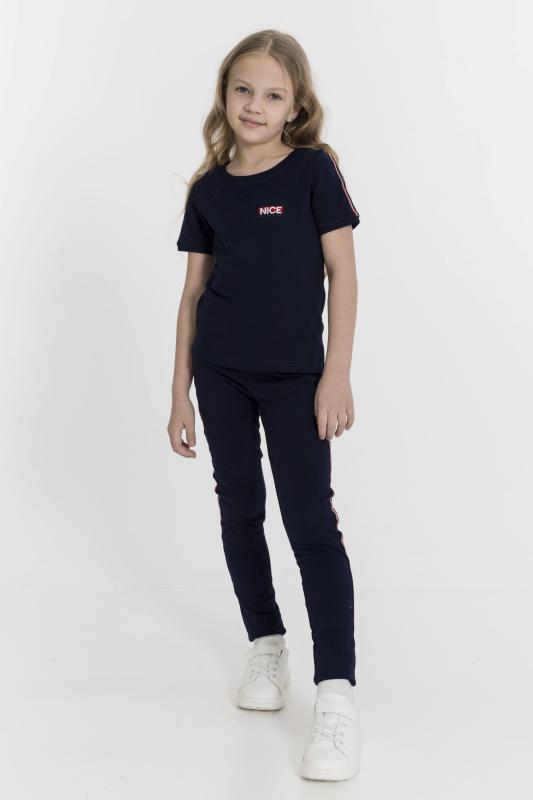Костюм выполнен из футер петли с лайкрой. Футболка с коротким рукавом и круглым вырезом горловины, спереди с вышивкой. Брюки с поясом на резине. На футболке по плечевым швам и рукавам, а также по боковым швам брюк настрочена тесьма.