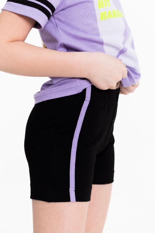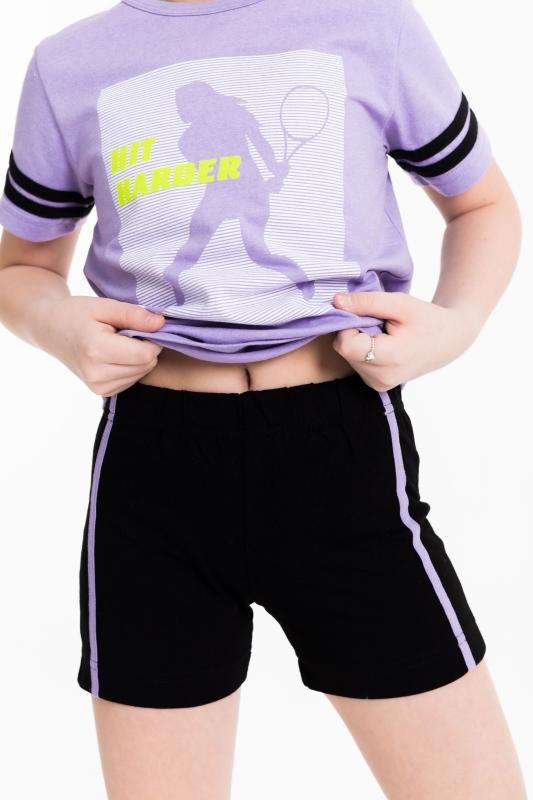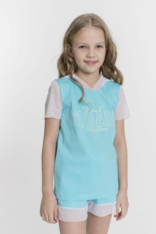 Летний костюм для девочек состоит из шорт и футболки. Футболка выполнена из однотонной кулирки с лайкрой. Рукава короткие, украшены декоративной тесьмой, плечевая часть открытая. Спереди на футболке нанесён принт. Шорты из футера с лайкрой, пояс на резине и шнуре. Сзади, с левой стороны накладной карман.