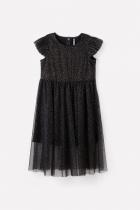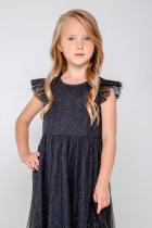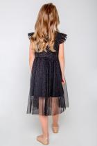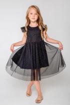 Черное платье для девочки Crockid из супрема с длинным верхним слоем из сетки с золотыми блёстками. Украшено воздушными крылышками. Застёгивается на спинке с помощью кнопок..