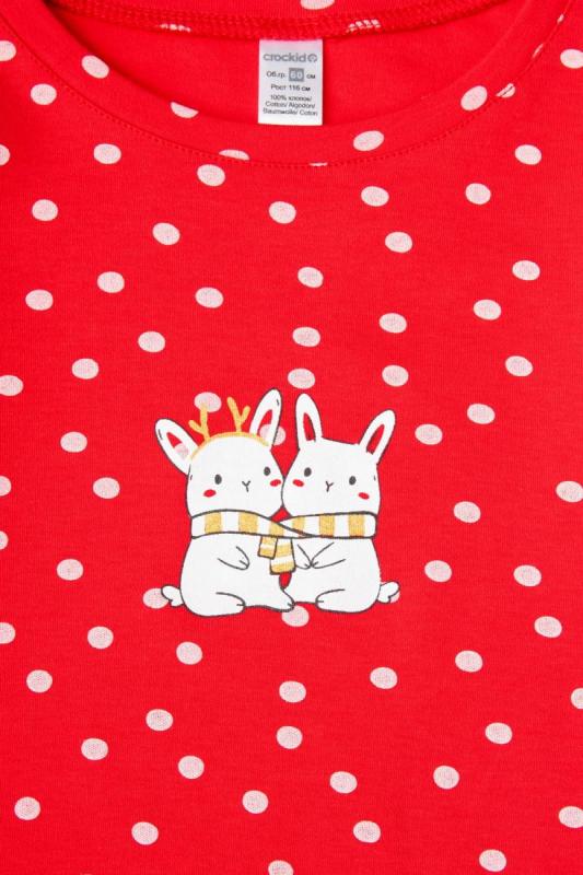 Детская сорочка для девочки Crockid из трикотажа интерлок с короткими рукавами. Украшена набивным рисунком в горох и принтом с новогодними зайками. Закруглённая спинка длиннее полочки.