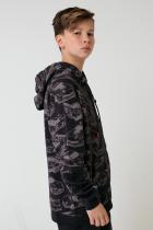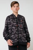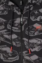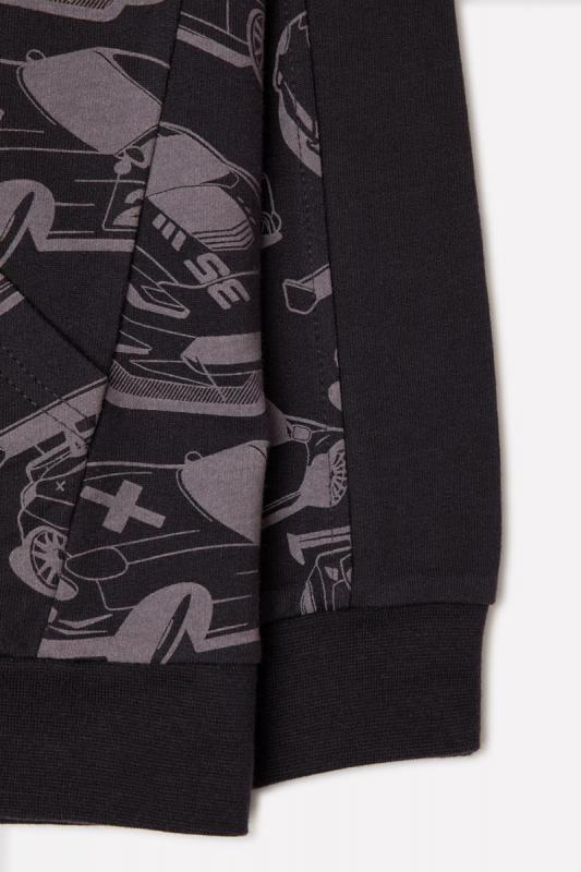 Куртка с капюшоном для мальчика из набивного футера петли. Капюшон утягивается с помощью шнурка. Застёгивается на тракторную молнию с удбным пуллером из ленты. Рукава-реглан со вставками ниже локтей оканчиваются эластичными манжетами. Внизу - мягкий пояс. Впереди карманы. Украшена изображением машин и принтом на груди.