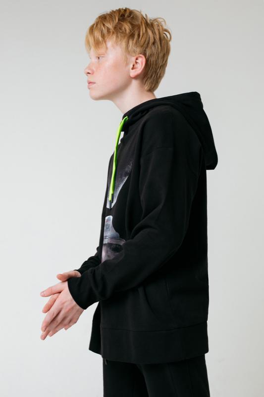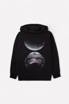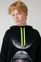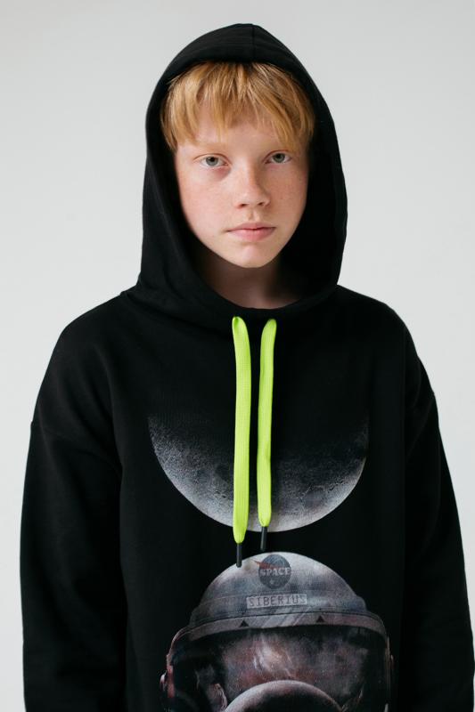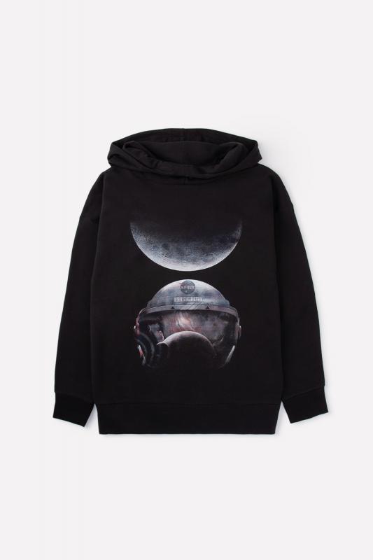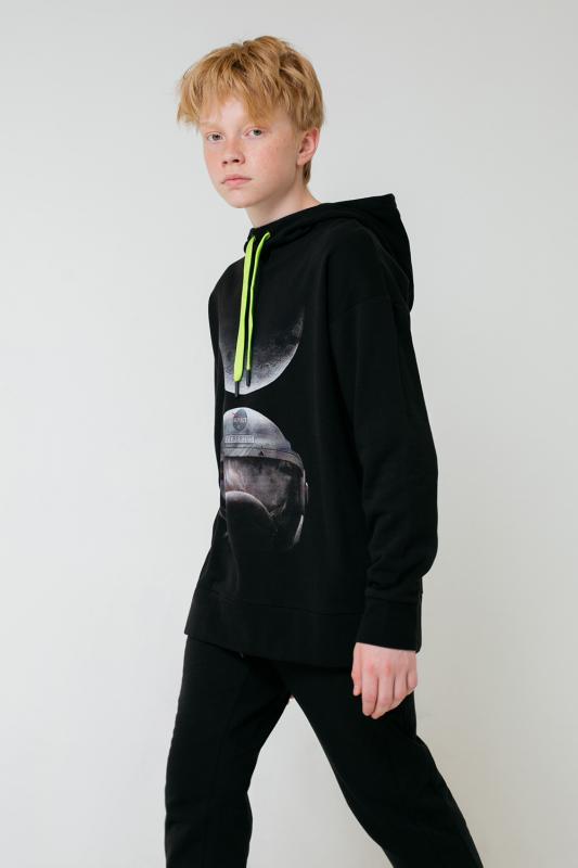 Толстовка с двойным капюшоном для мальчика. Сшита из тёплого футера с начёсом. Капюшон утягивается с помощью шнурка. Спущенные плечи придают свободный объём. На рукавах - эластичные манжеты. Внизу - мягкий пояс. Украшена космическим принтом на полочке.