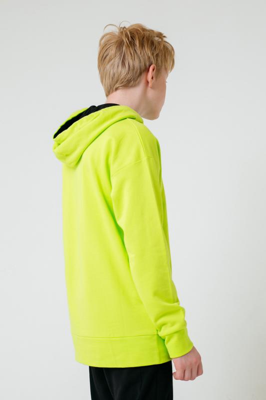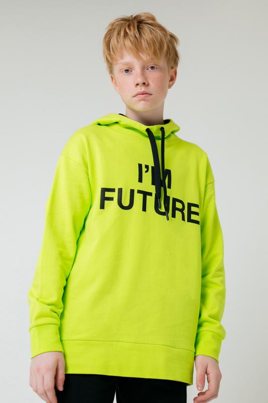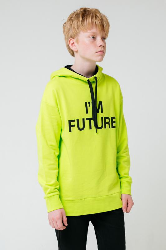 Толстовка с двойным капюшоном для мальчика. Сшита из тёплого футера с начёсом. Капюшон утягивается с помощью шнурка. Спущенные плечи придают свободный объём. На рукавах - эластичные манжеты. Внизу - мягкий пояс. Украшена надписью на полочке.