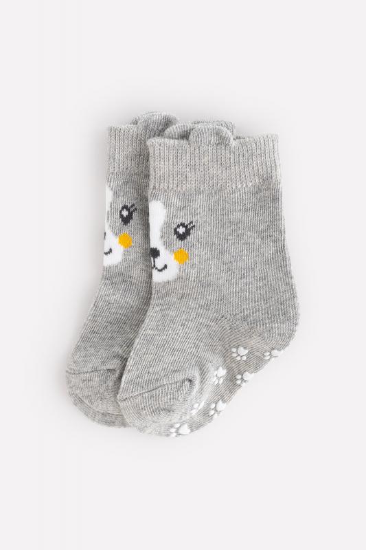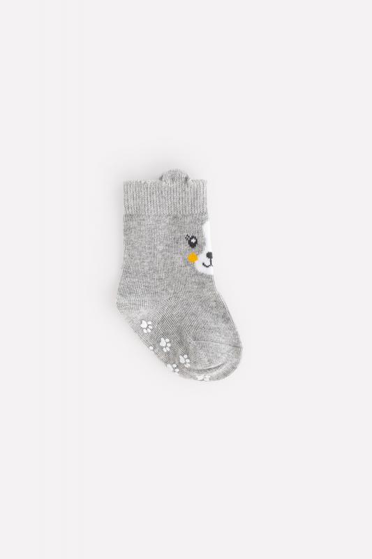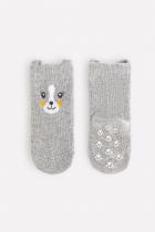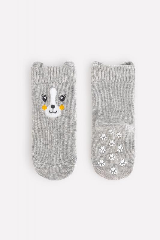 Трикотажные носки Crockid с эластичной резинкой по верхнему краю. Спереди рисунок с изображением мордочки и объёмными ушками. На подошве противоскользящие резиновые стопперы.