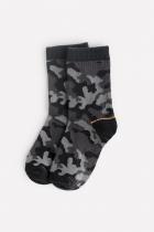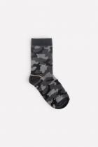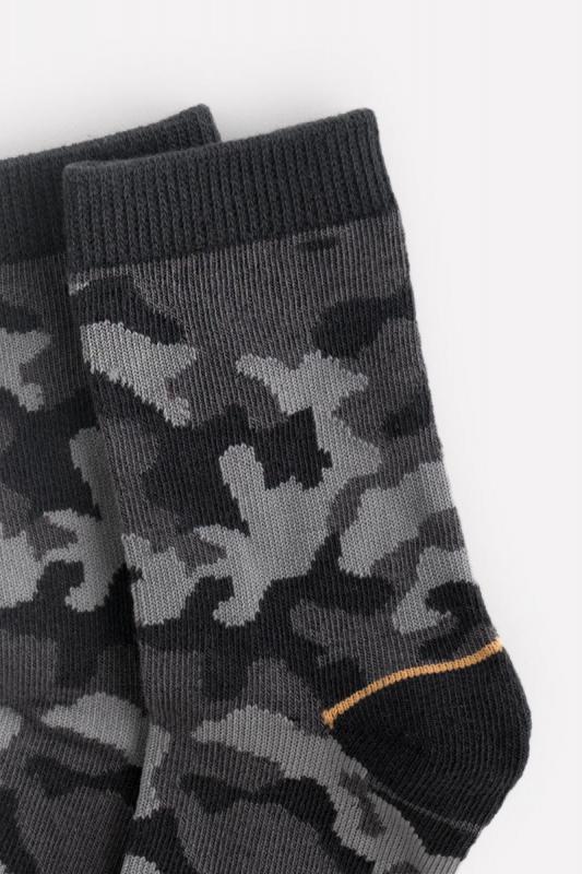 Трикотажные носки Crockid. Эластичная резинка по верхнему краю. Украшены камуфляжным рисунком и контрастной оранжевой полосой над пяткой.