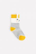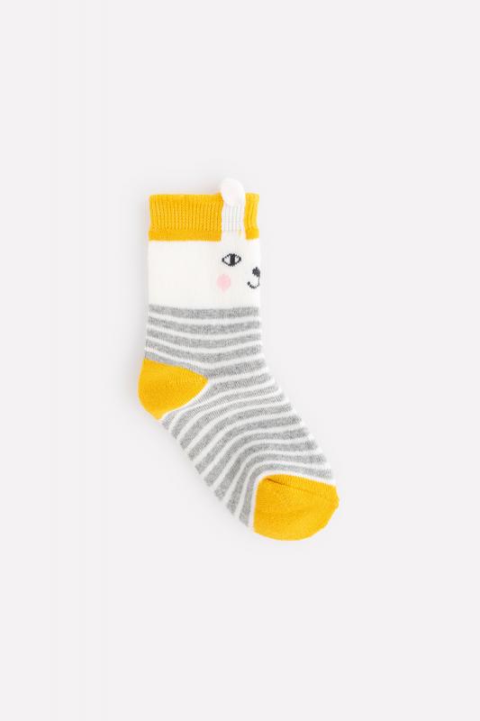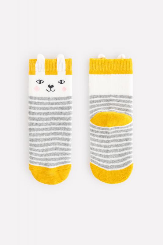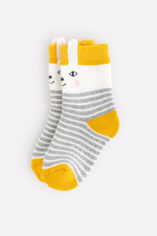 Тёплые махровые носки Crockid. Украшены полосками и мордочкой зайца. Эластичная резинка по верхнему краю с объёмными заячьими ушками.