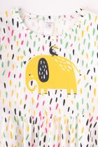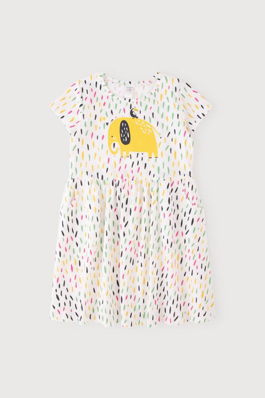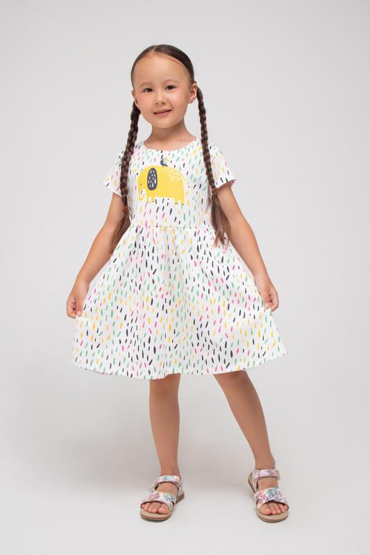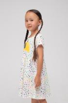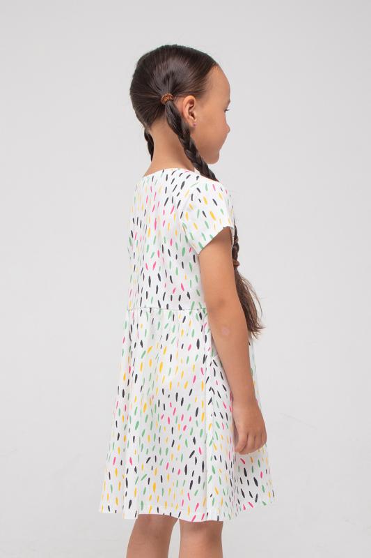 Отрезное платье для девочки Crockid с короткими втачными рукавами. Сшито из набивного трикотажа супрем с рисунком из разноцветных конфетти. Украшено на груди принтом. Присборено на талии. По бокам карманы.