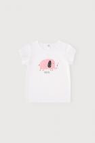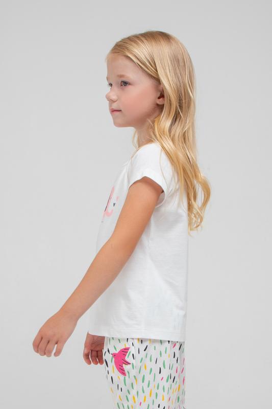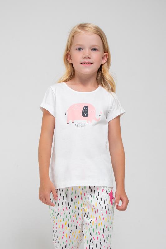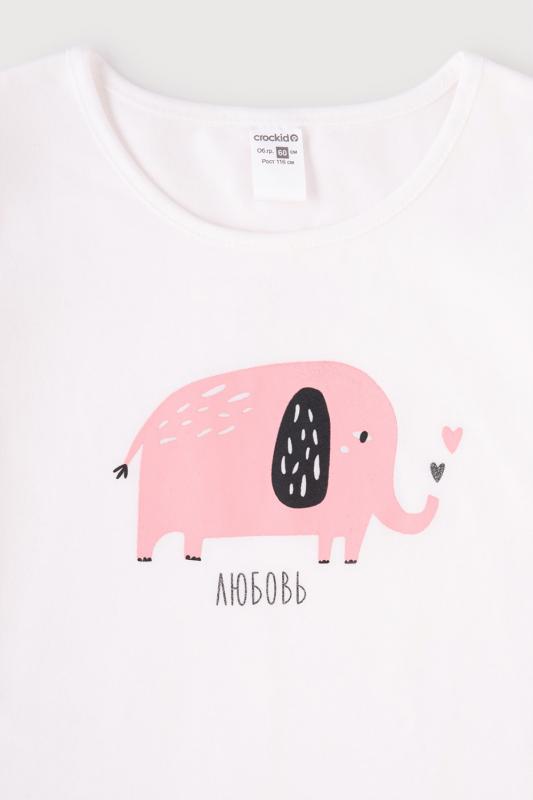 Лёгкая футболка для девочки Crockid с короткими рукавами. Сшита из однотонного трикотажа супрем. Украшена принтом на груди с изображением слоника и надписью. Рукава и низ обработаны плоскими швами.